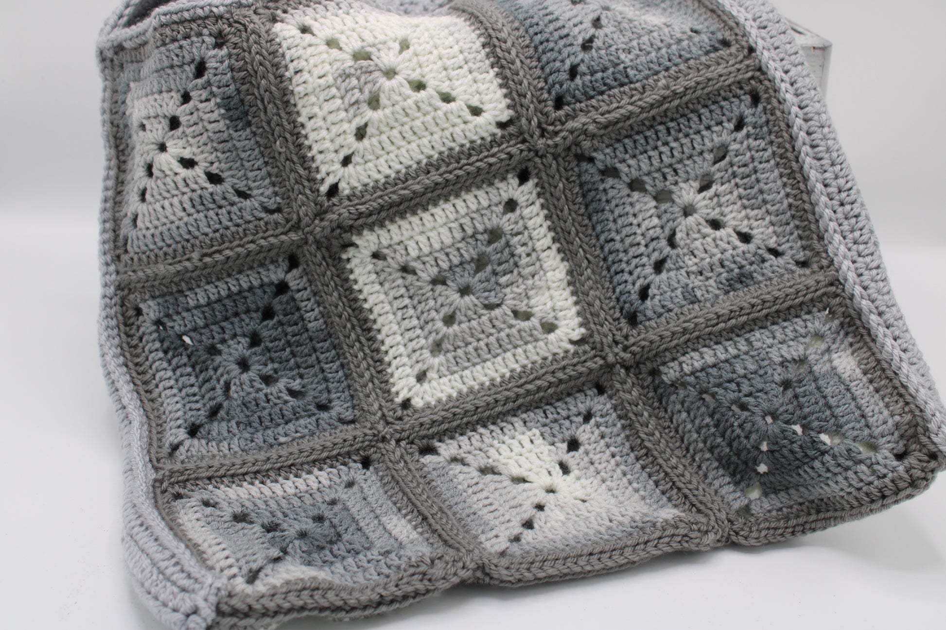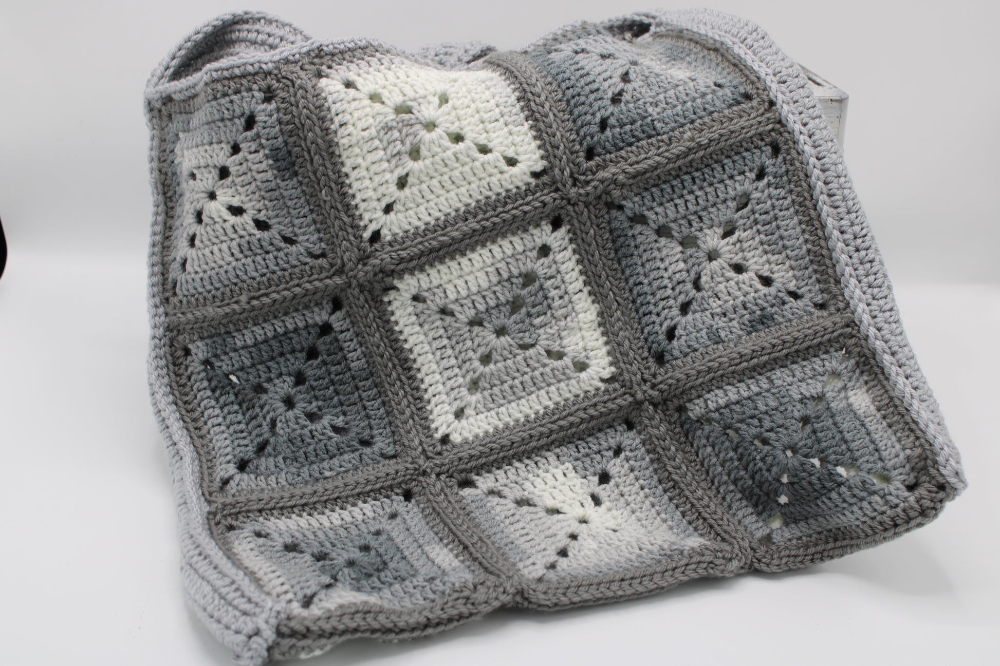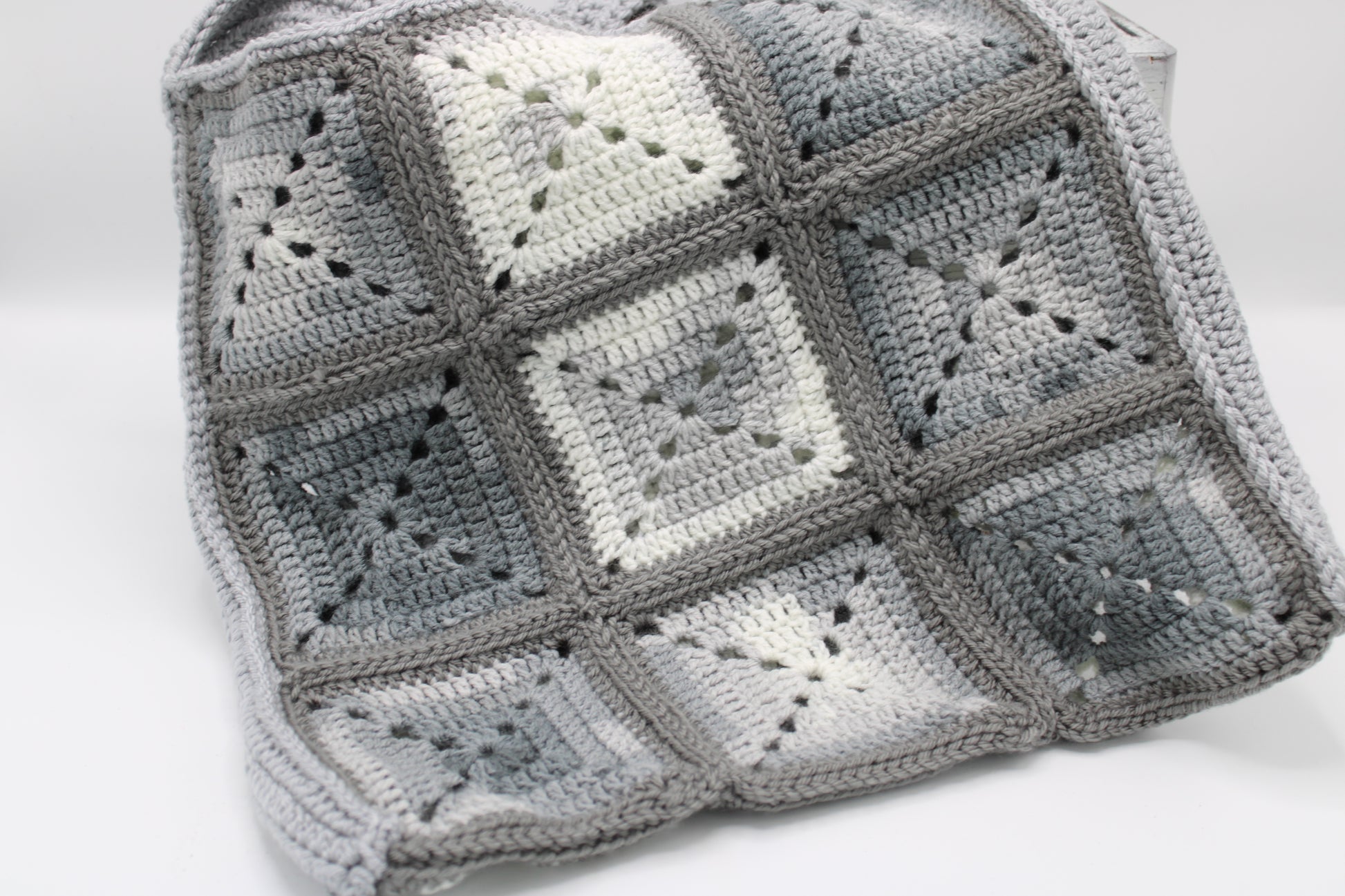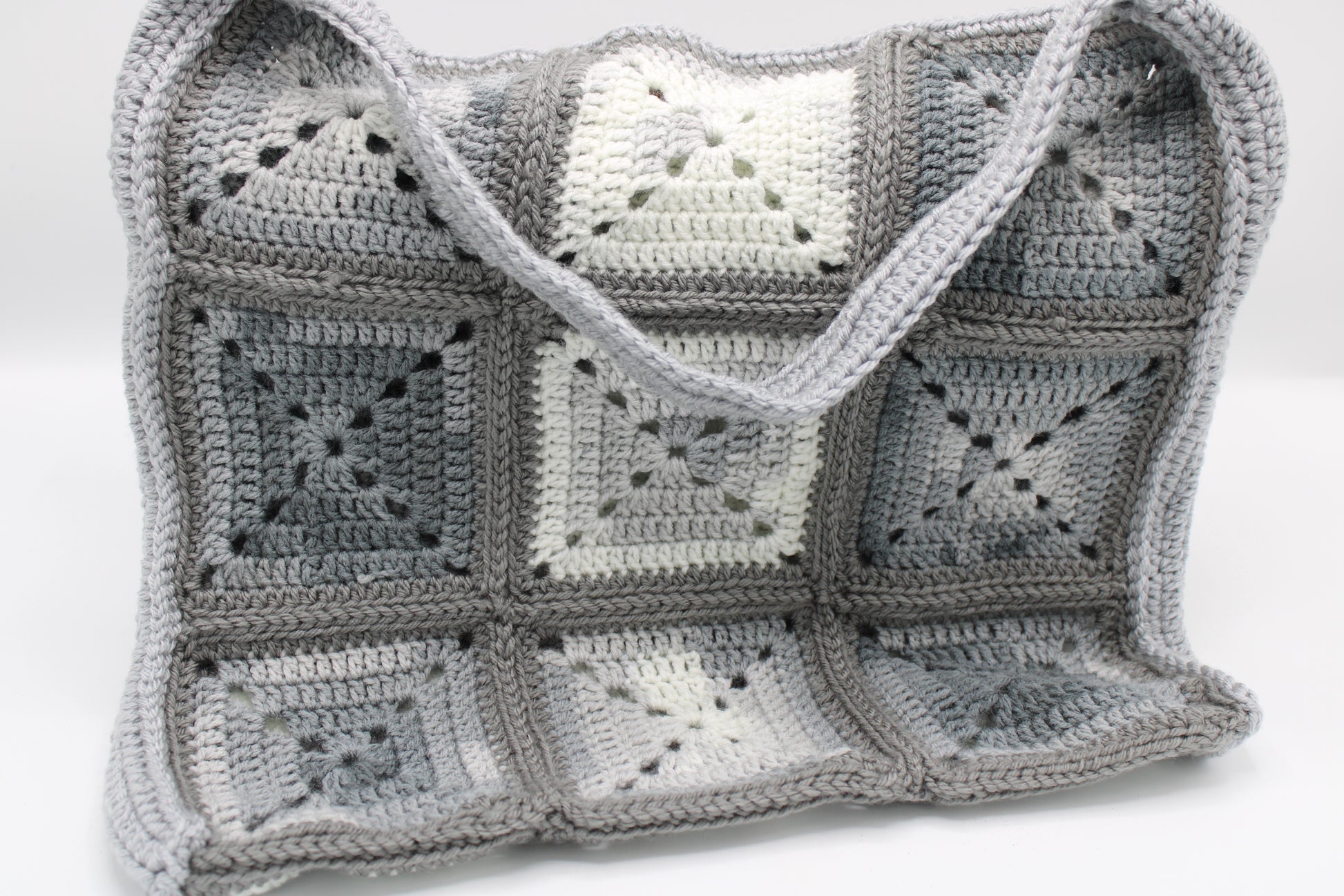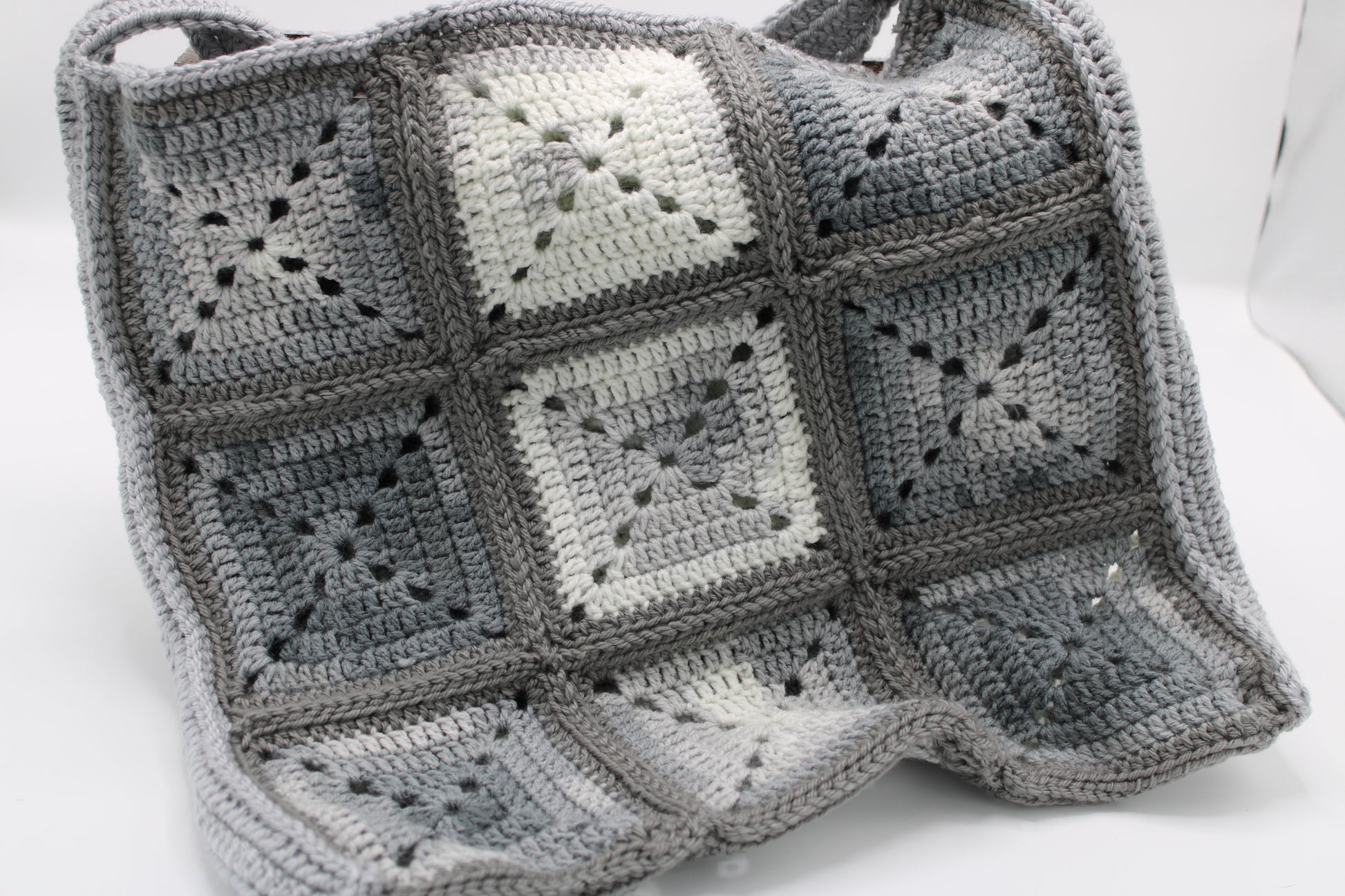 Practical and fun granny square market bag. It is 13" x 14" with secure crocheted strap and sides. It is crocheted with 100% acrylic yarn and is washable and dryable.