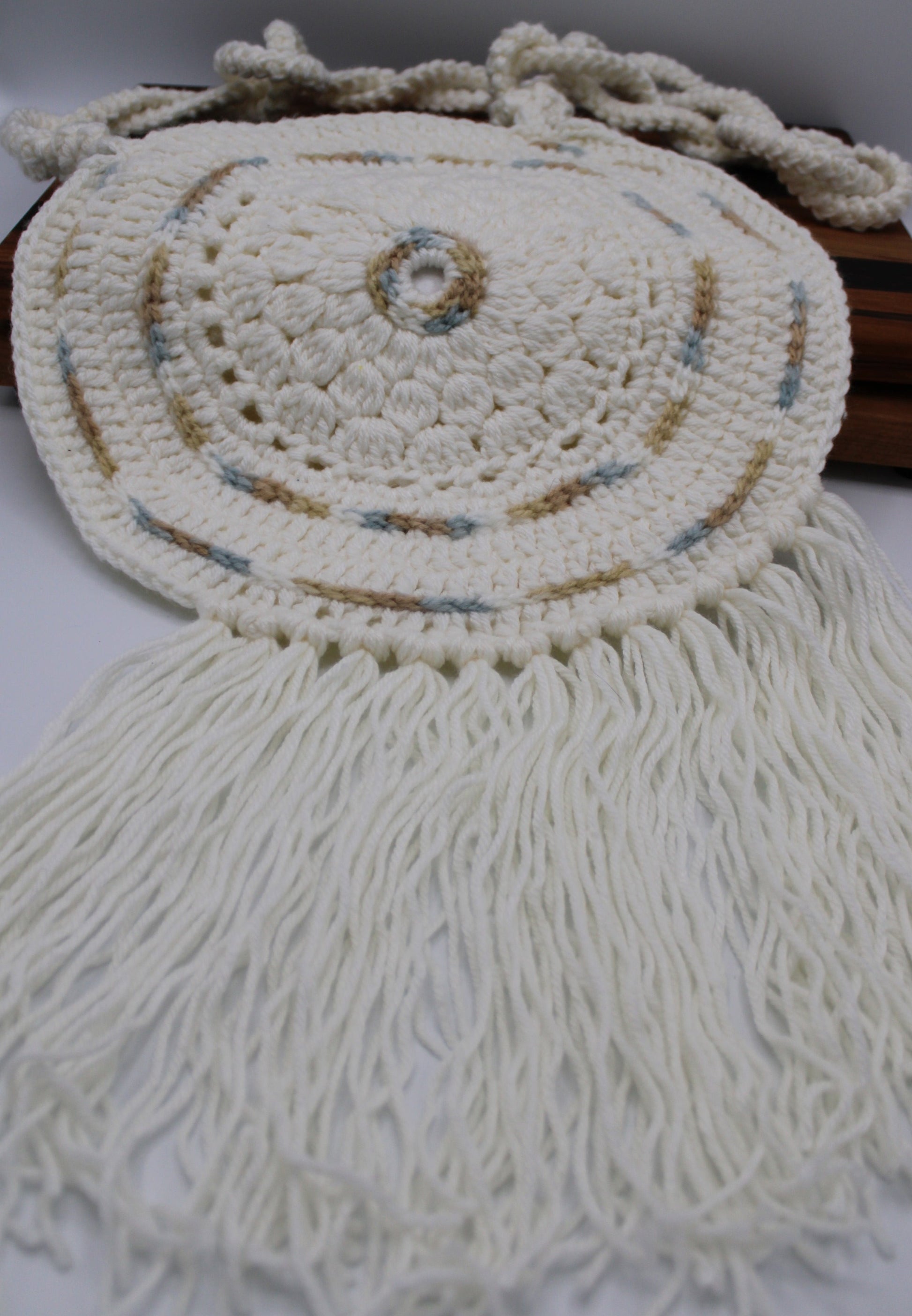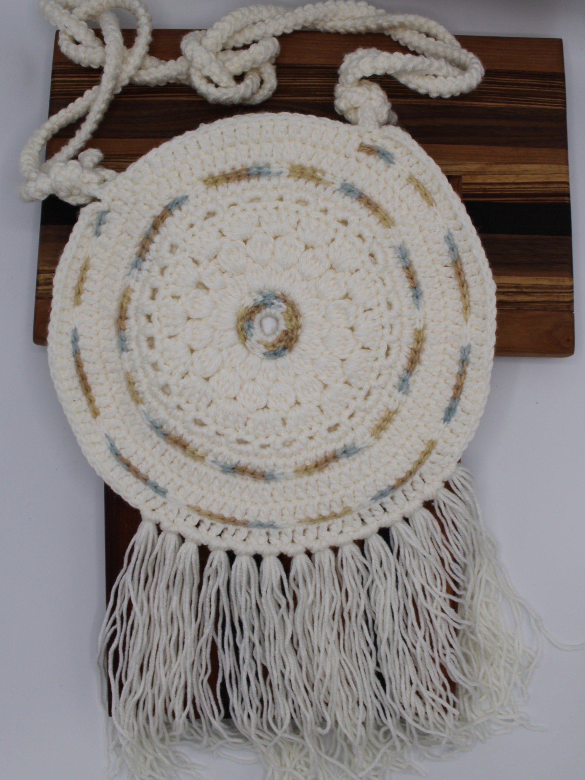 A throwback to the sixties, this hip fringed purse is fun and versatile. It is 11" round with versatile crocheted straps that allows you to choose to wear it as a cross body bag, over the shoulder or on your wrist. There is a magnetic closure and the purse is lined. The purse is made with 100% acrylic yarn and is washable. Because of the fringe we recommend that you had wash and lay flat to dry.