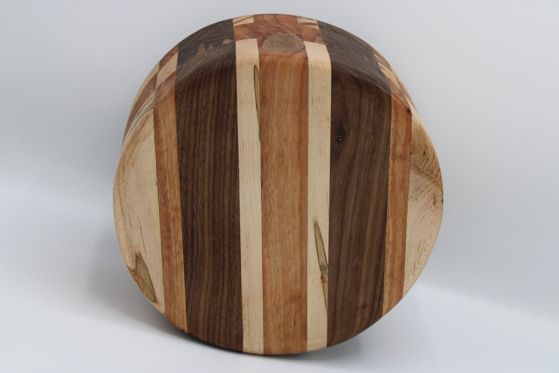 Design #051 - handmade with three different hardwoods - Red Grandis, Mahogany and Wormy Red Maple - Round design with nine stripes. It is ready to take on any task in your home!
