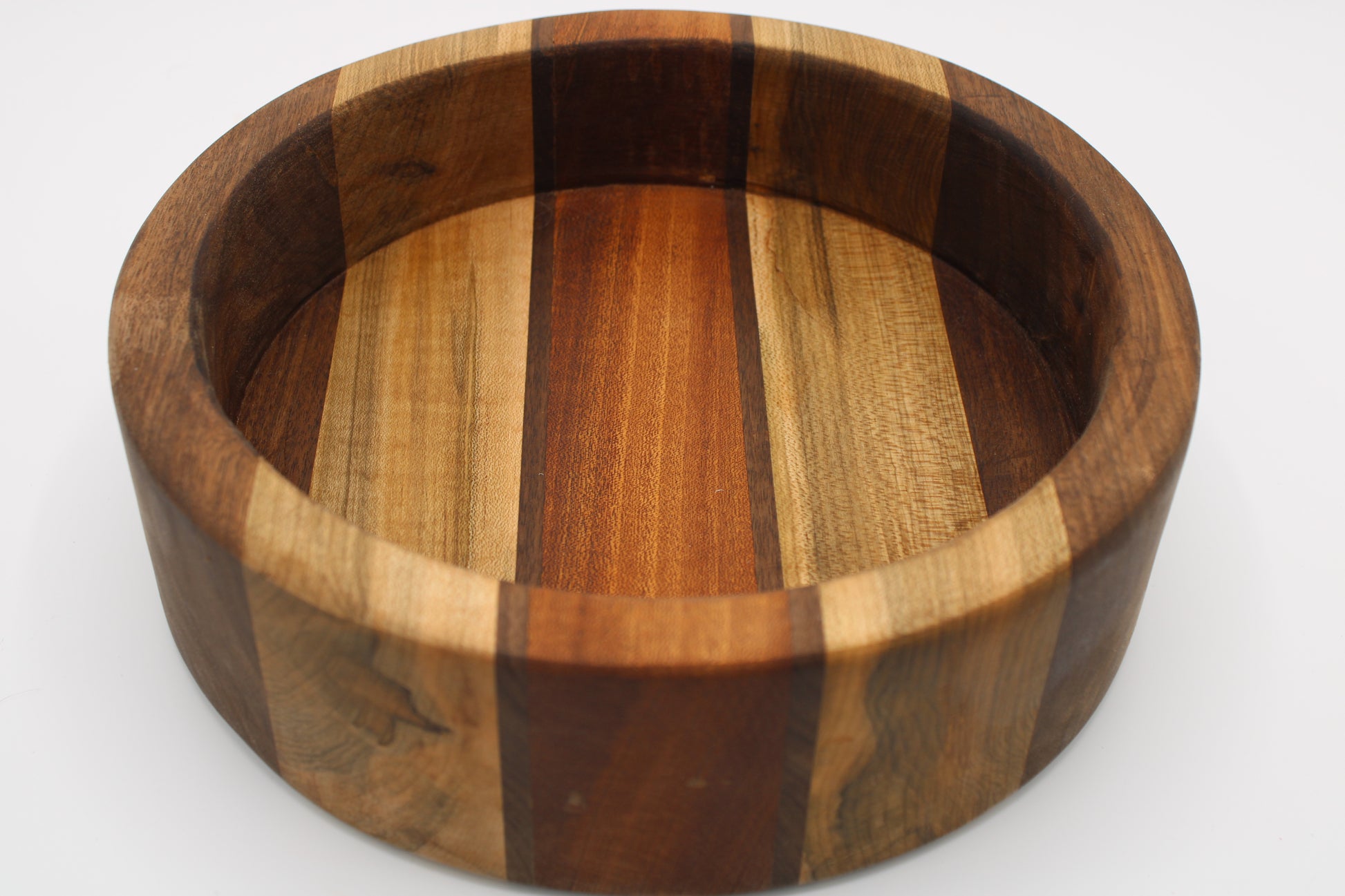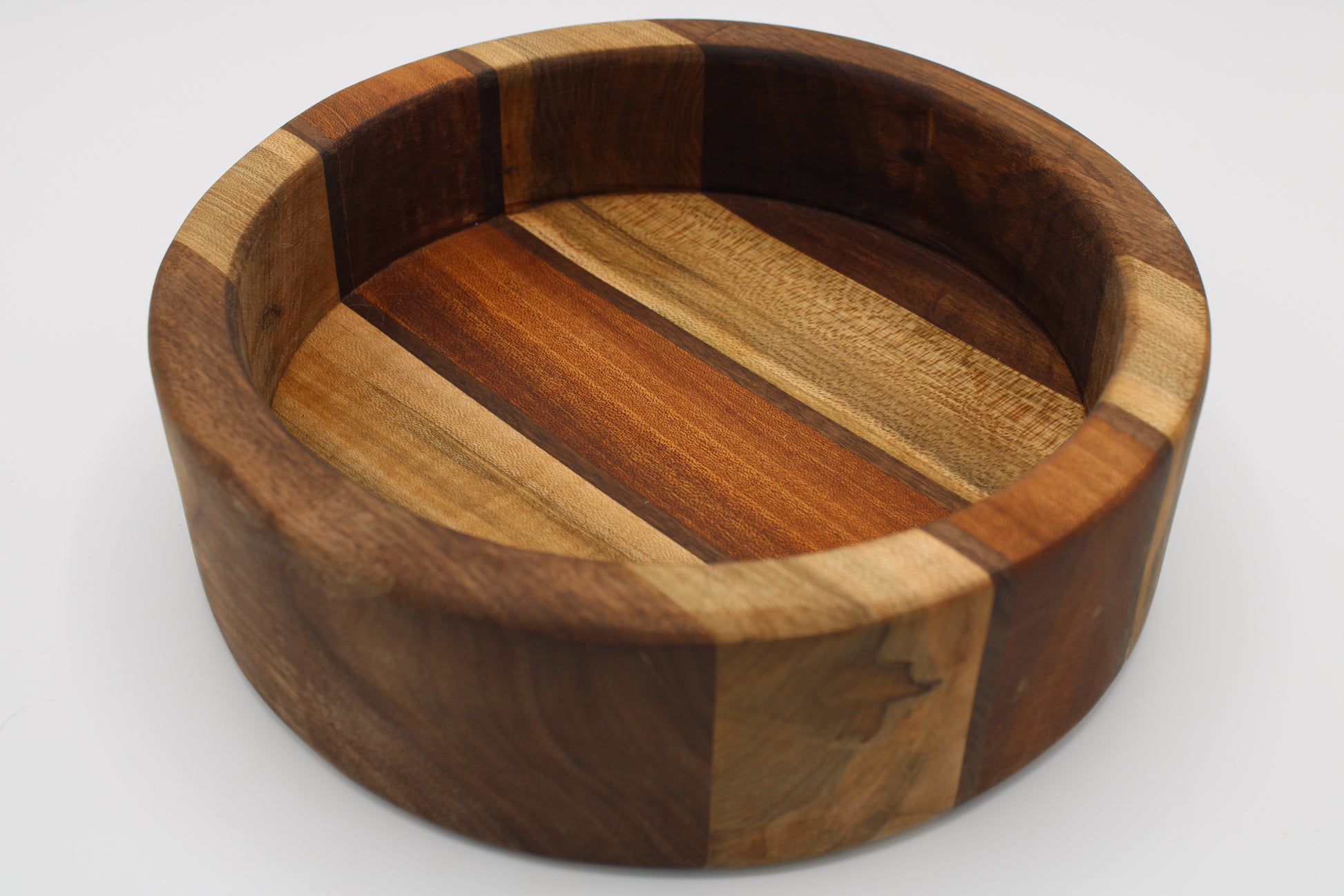 Design #064 - handmade with three different hardwoods - Walnut, Sapele and Wormy Red Maple - Round design with seven stripes. It is ready to take on any task in your home!