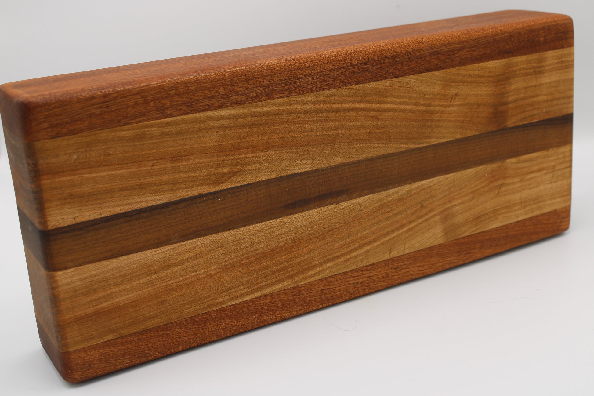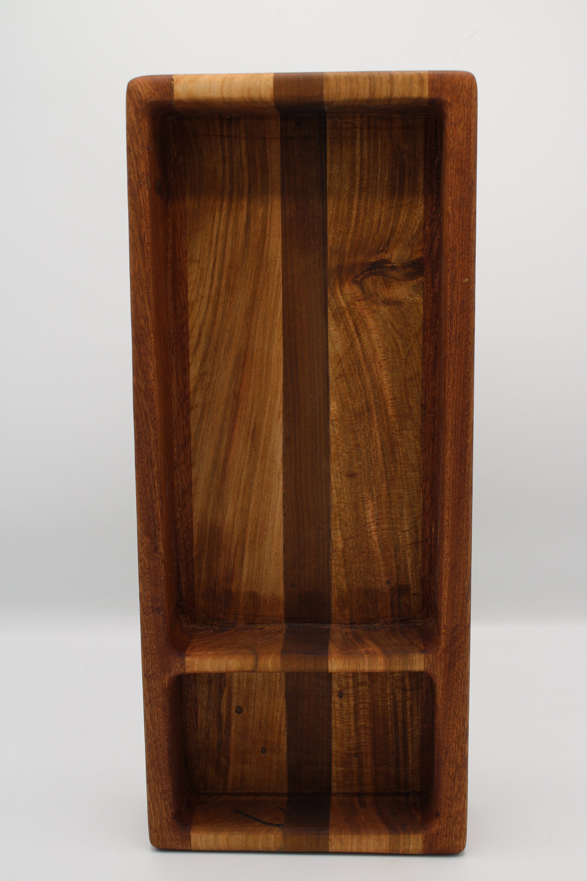 Design #067 - handmade with three different hardwoods - Walnut, Sapele and Wormy Red Maple - Dual compartment rectangle design with five stripes. It is ready to take on any task in your home!