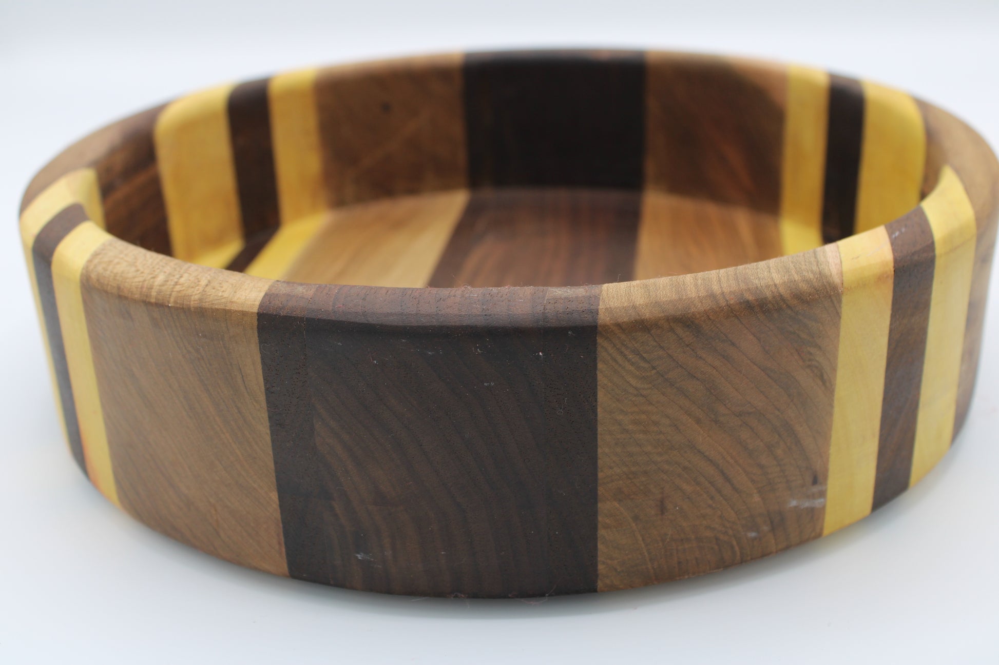 Design #068 - handmade with four different hardwoods - Walnut, Yellowheart, Peruvian Walnut and Wormy Red Maple - Round design with eleven stripes. It is ready to take on any task in your home!