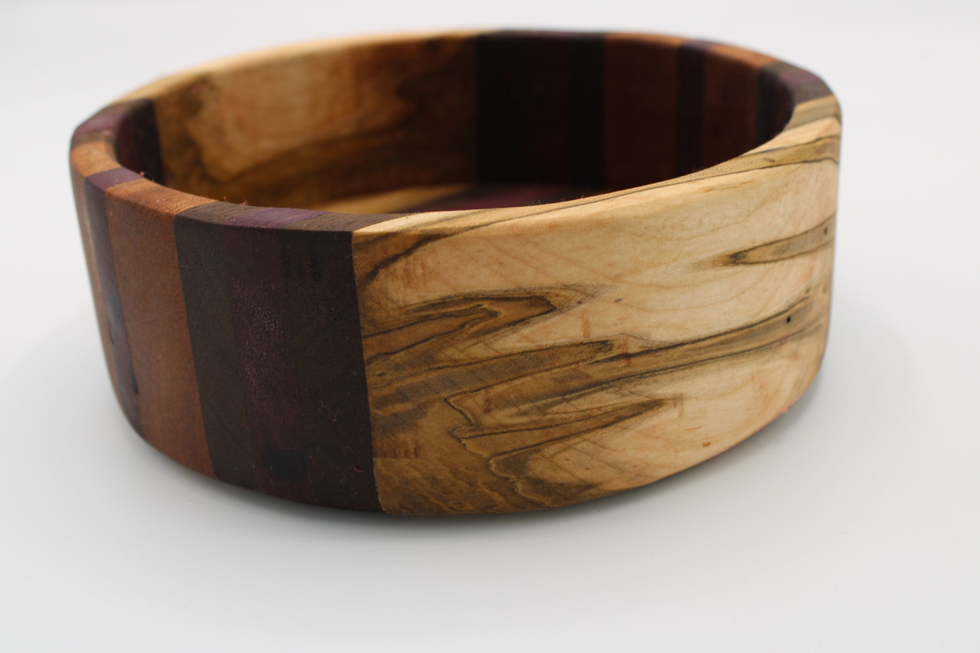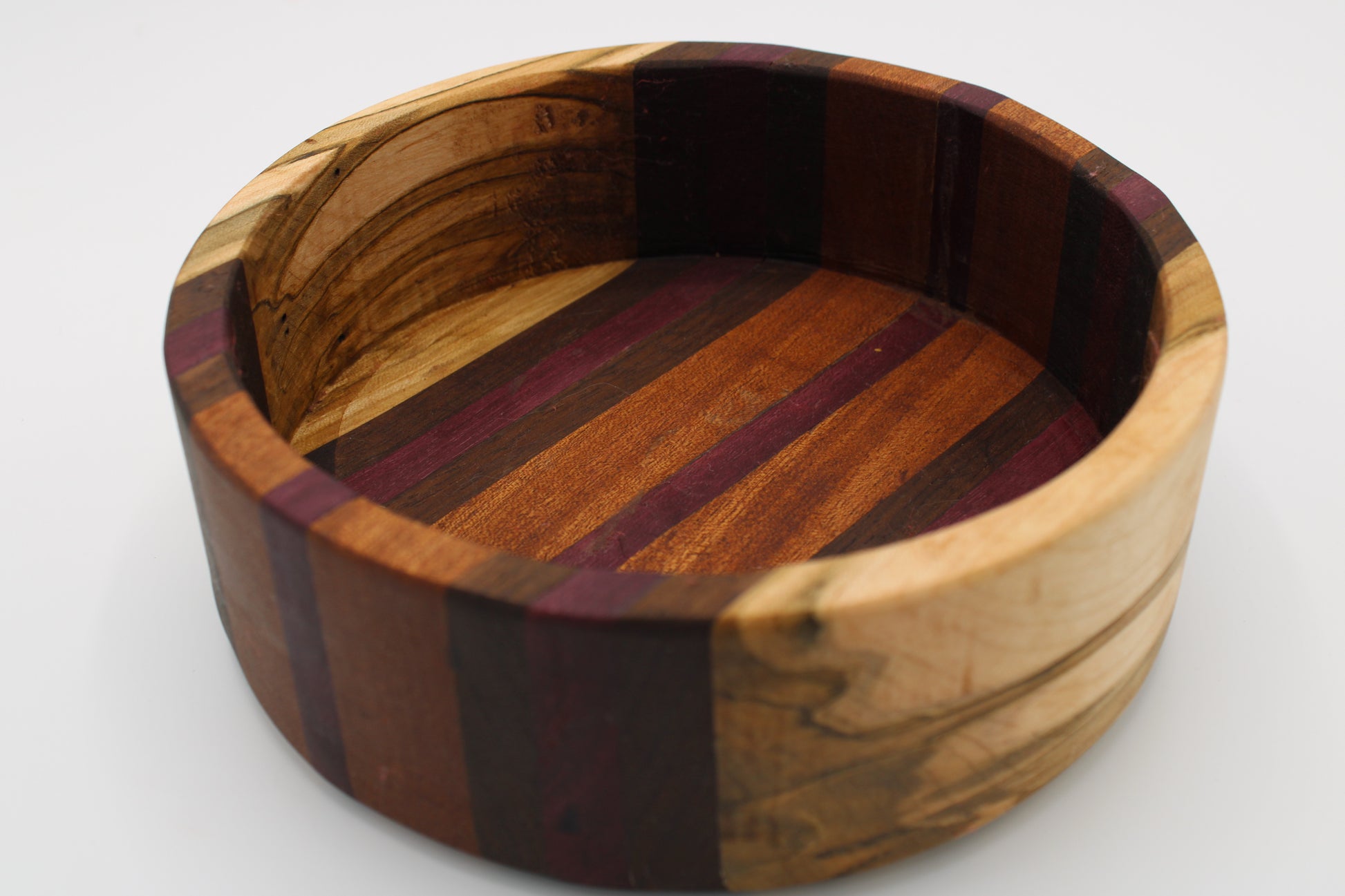 Design #070 - handmade with four different hardwoods - Walnut, Sapele, Purpleheart and Wormy Red Maple - Round design with eleven stripes. It is ready to take on any task in your home!