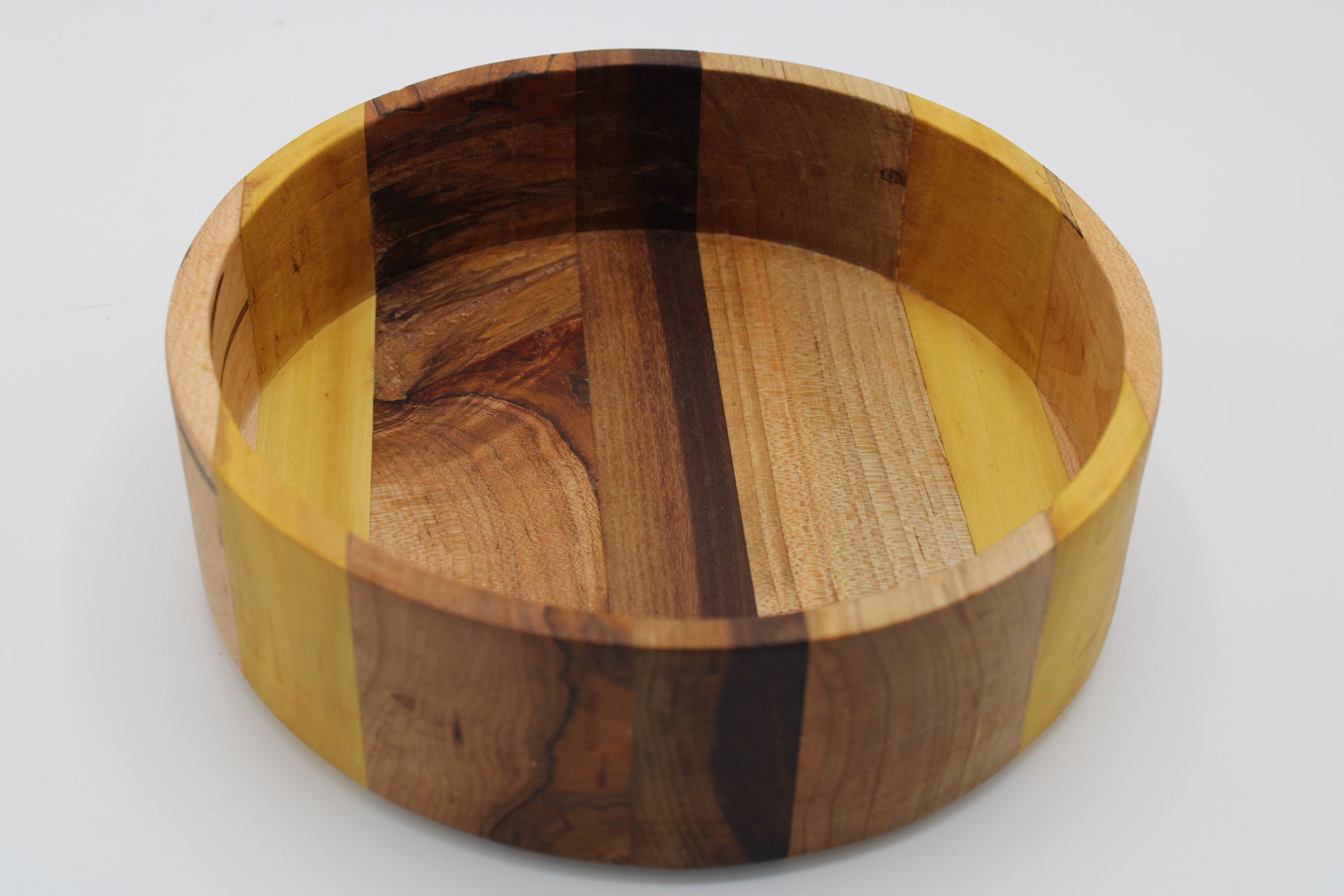 Design #082 - handmade with three different hardwoods - Wormy Red Maple, Yellowheart and Walnut - Round design with seven stripes. It is ready to take on any task in your home!