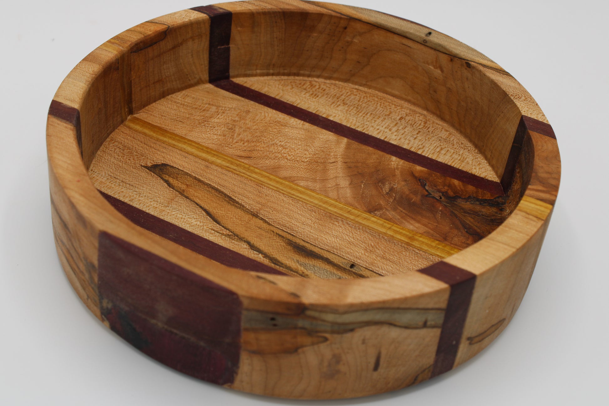 Design #083 - handmade with three different hardwoods - Wormy Red Maple, Canarywood and Purpleheart - Round design with nine stripes. It is ready to take on any task in your home!