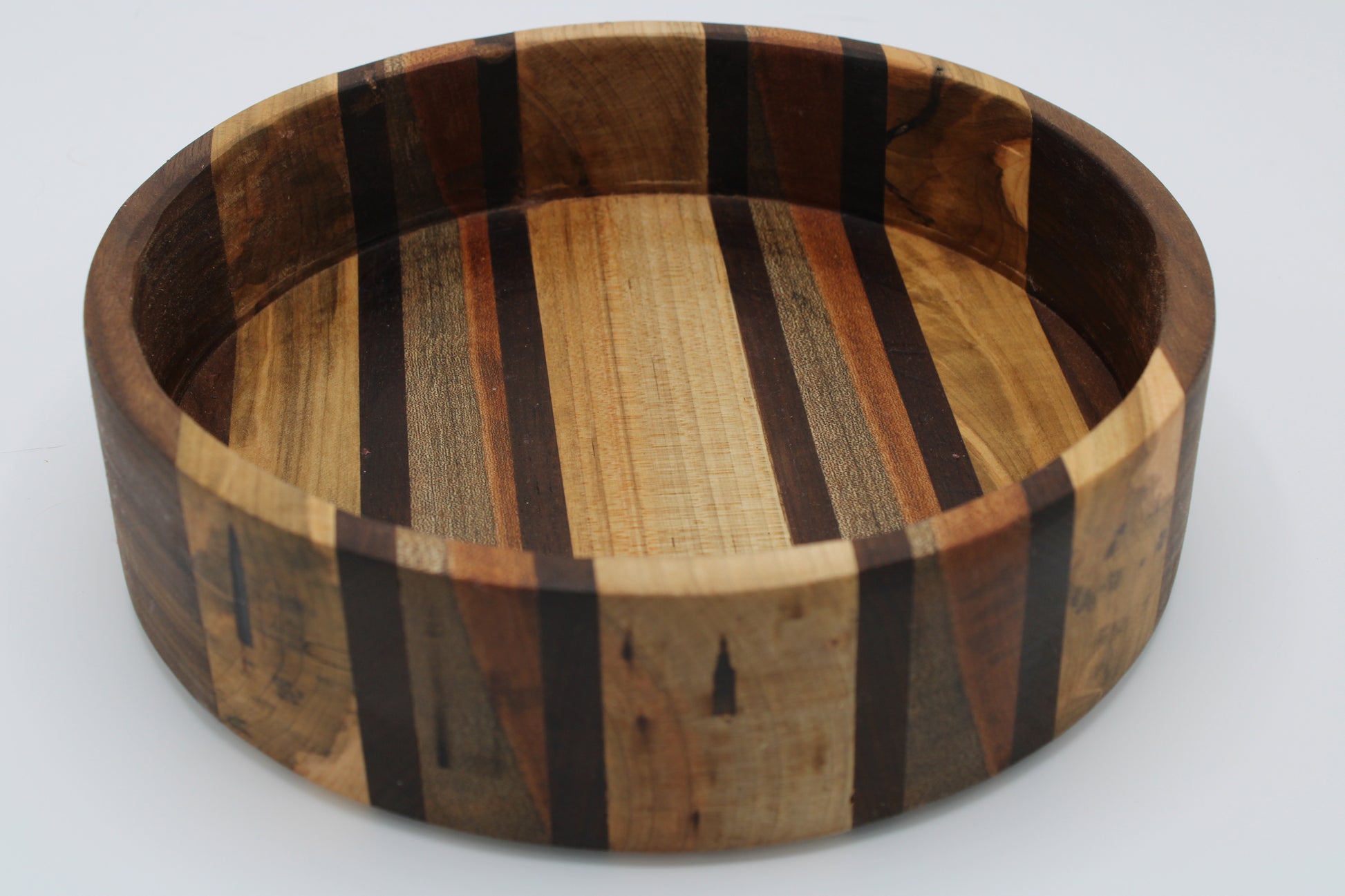 Design #084 - handmade with four different hardwoods - Walnut, Wormy Red Maple, Peruvian Walnut and Sapele - Round design with eleven stripes. It is ready to take on any task in your home!