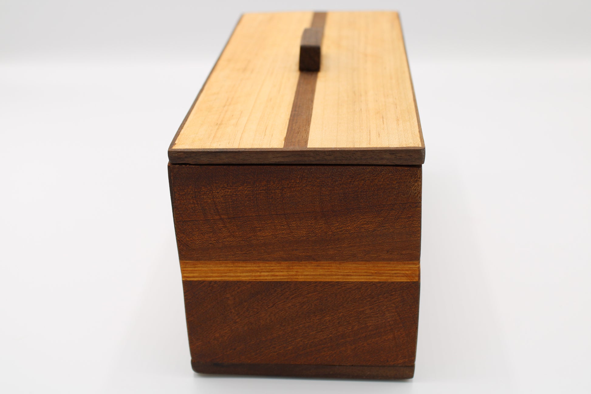 Design #102 - handmade with four different hardwoods - Sapele, Wormy Red Maple, Walnut and Canarywood - Rectangle design with three stripes. It is ready to take on any task in your home!