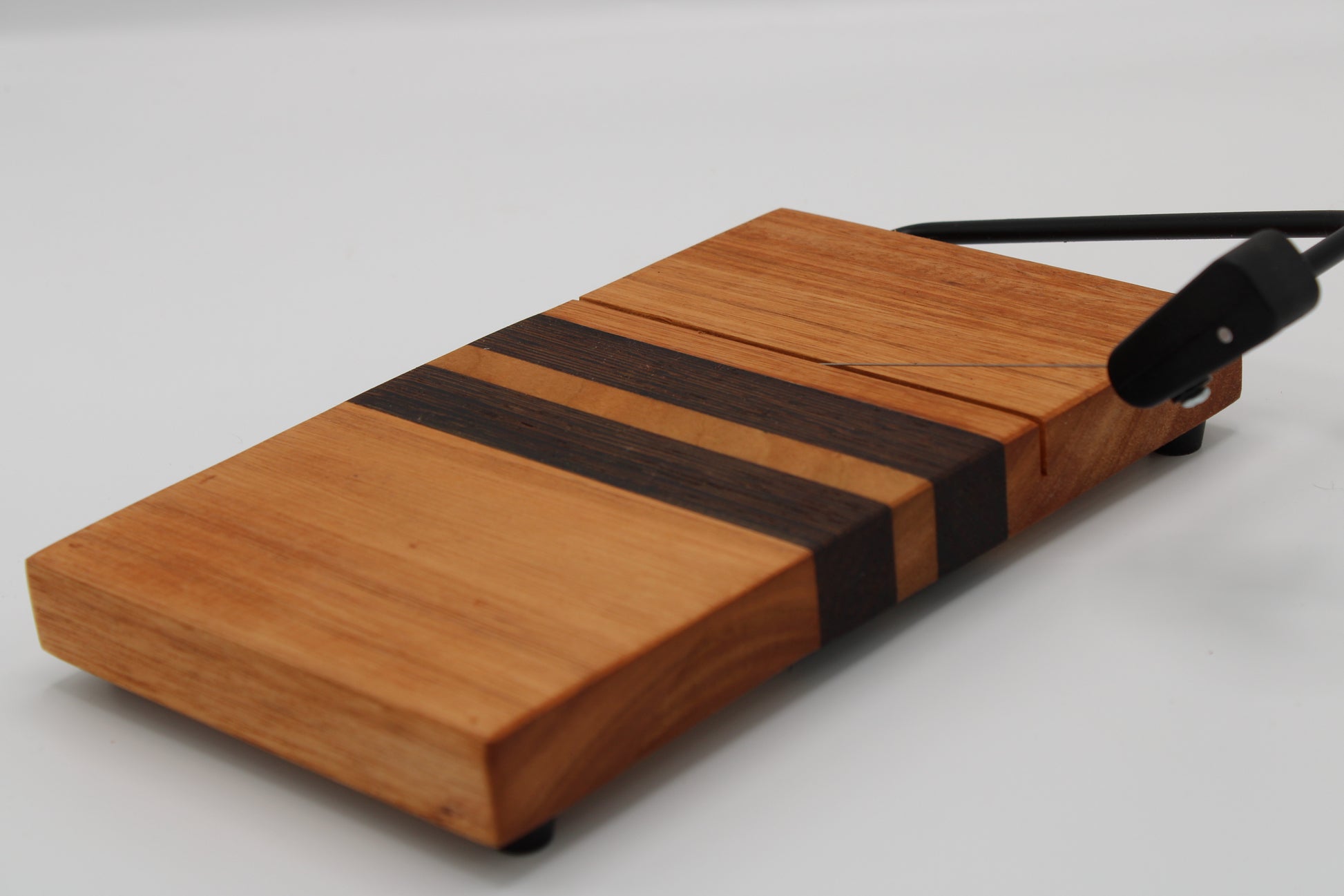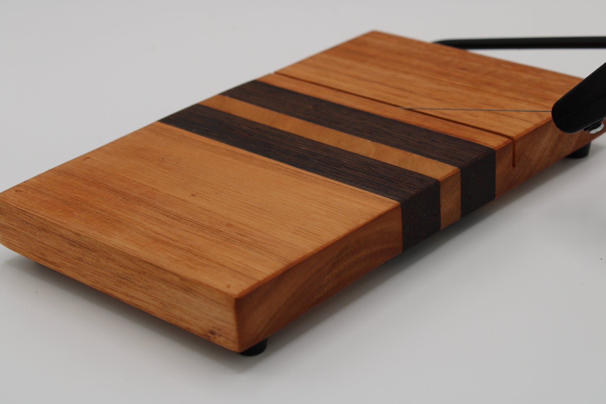 Design #129 - handmade with two different hardwoods - Red Grandis and Wenge - designed with five stripes. Board includes black wire cheese cutter