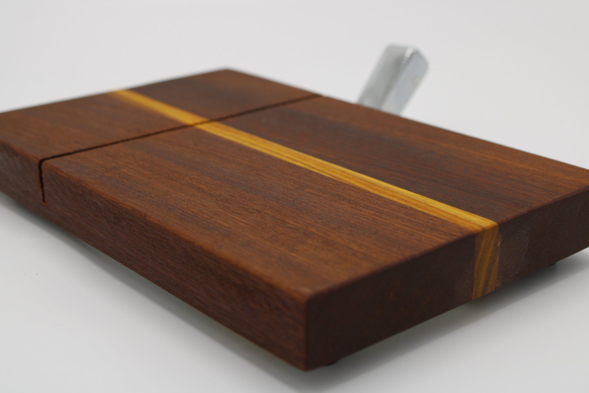 Design #160 - handmade with two different hardwoods - Canarywood and Sapele - designed with three stripes. Board includes wire cheese cutter