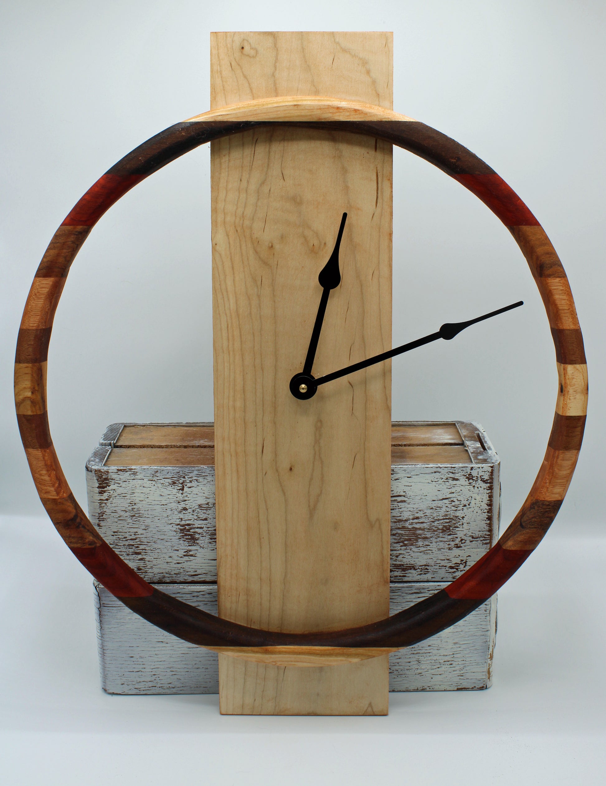 Design #117 - handmade with seven different hardwoods - Hickory, Padauk, Patagonian Rosewood, Red Grandis, Sapele and Maple - Designed with eleven stripes and a quiet quartz clock movement with black aluminum hour and minute hands including a AA battery. A unique take on a wall clock and ready to take on any room in your home!