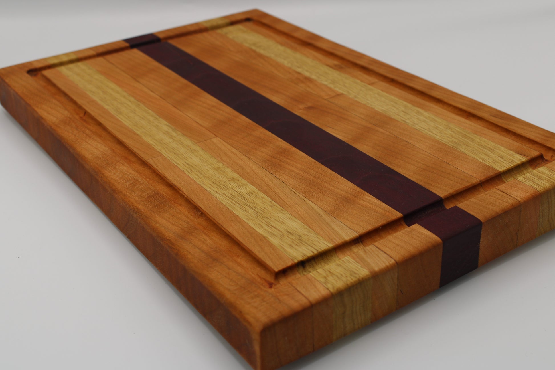 Design #038 - handmade with three different hardwoods - Cherry, Black Limba and Purpleheart - designed with nine stripes. This is an end grain board creating a true chopping/butcher block so your knife stays sharper because you are slicing in between the wood fibers. It is ready to take on any cutting task in your kitchen.