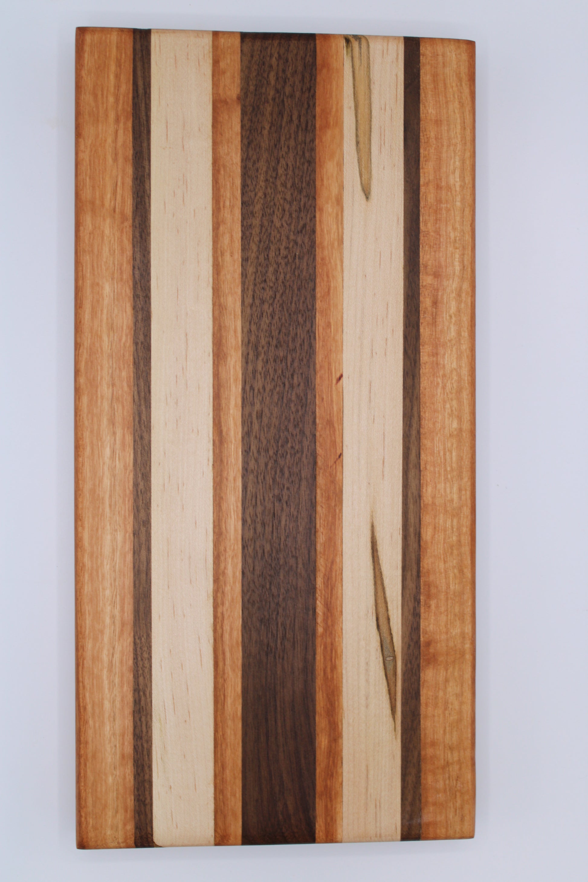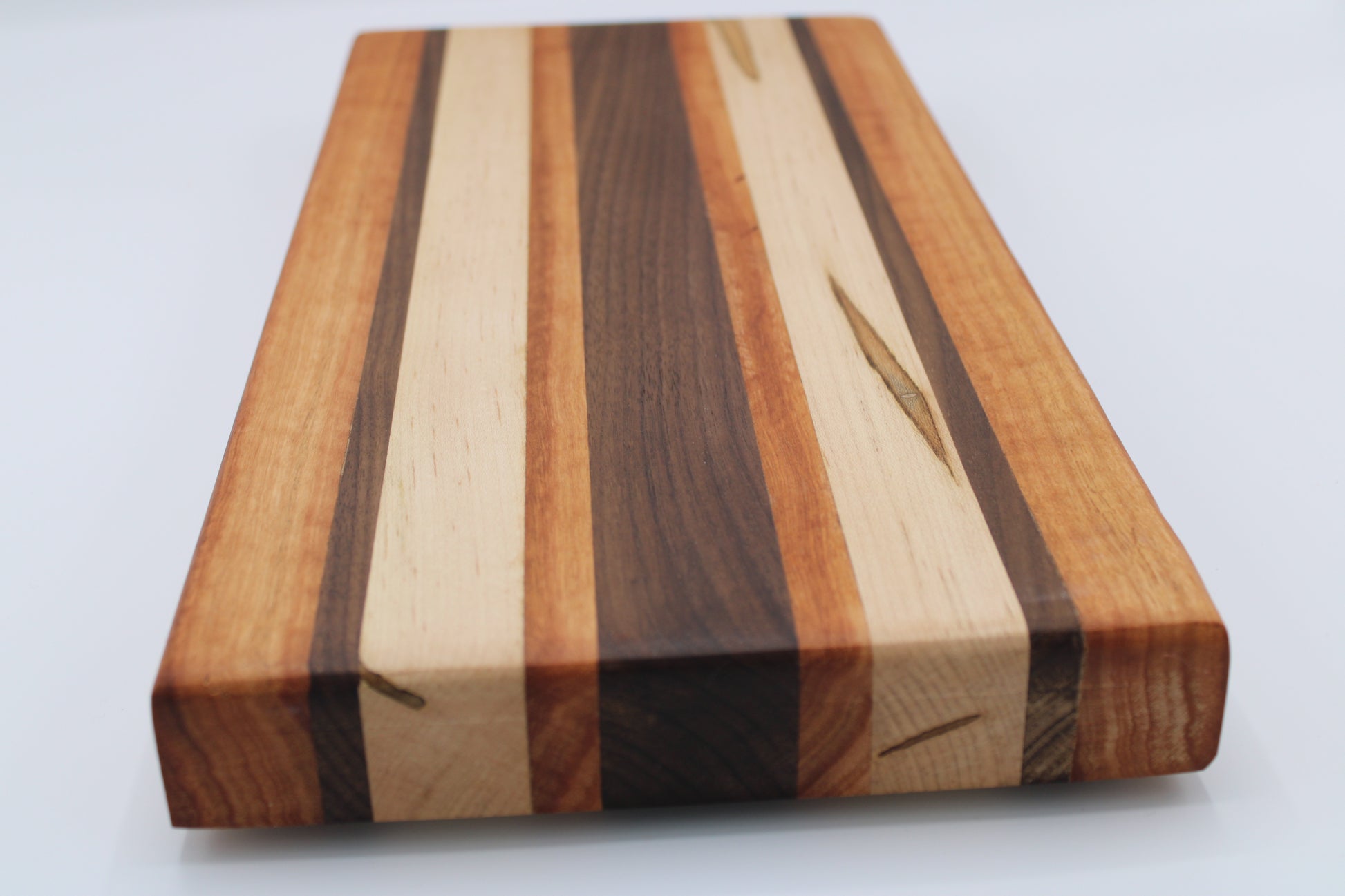 Design #045 - handmade with three different hardwoods - Walnut, Red Grandis and Wormy Red Maple - designed with nine vertical stripes. This is an end grain board creating a true chopping/butcher block so your knife stays sharper because you are slicing in between the wood fibers. It is ready to take on any cutting task in your kitchen.