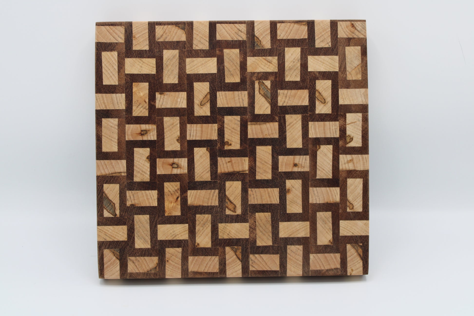 Design #048 - handmade with two different hardwoods - Red Grandis and Wormy Red Maple - designed in a basketweave pattern. This is an end grain board creating a true chopping/butcher block so your knife stays sharper because you are slicing in between the wood fibers. It is ready to take on any cutting task in your kitchen.