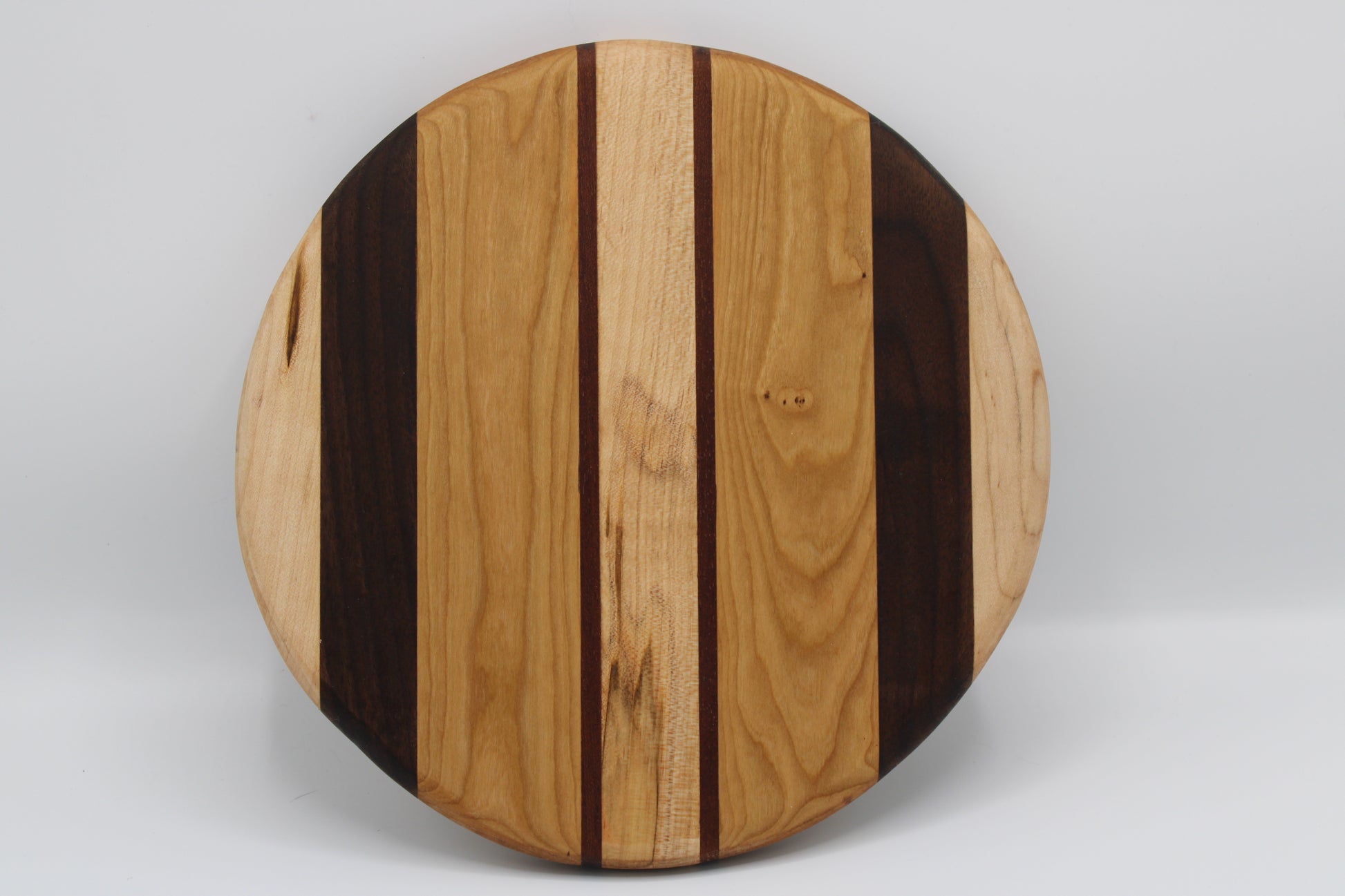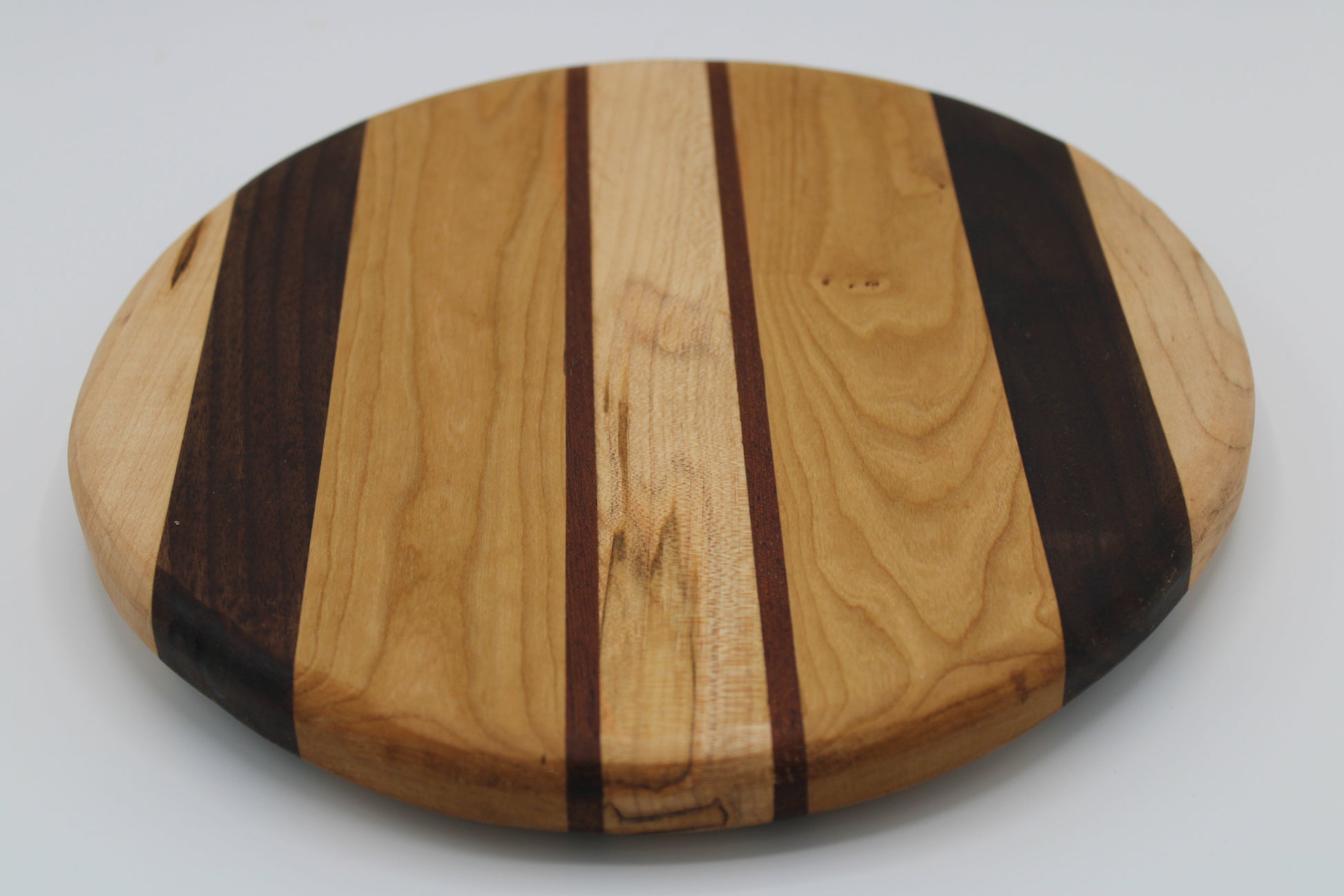 Design #055 - handmade with three different hardwoods - Cherry, Walnut and Mahogany - designed with twelve stripes. It is ready to take on any cutting task in your kitchen.