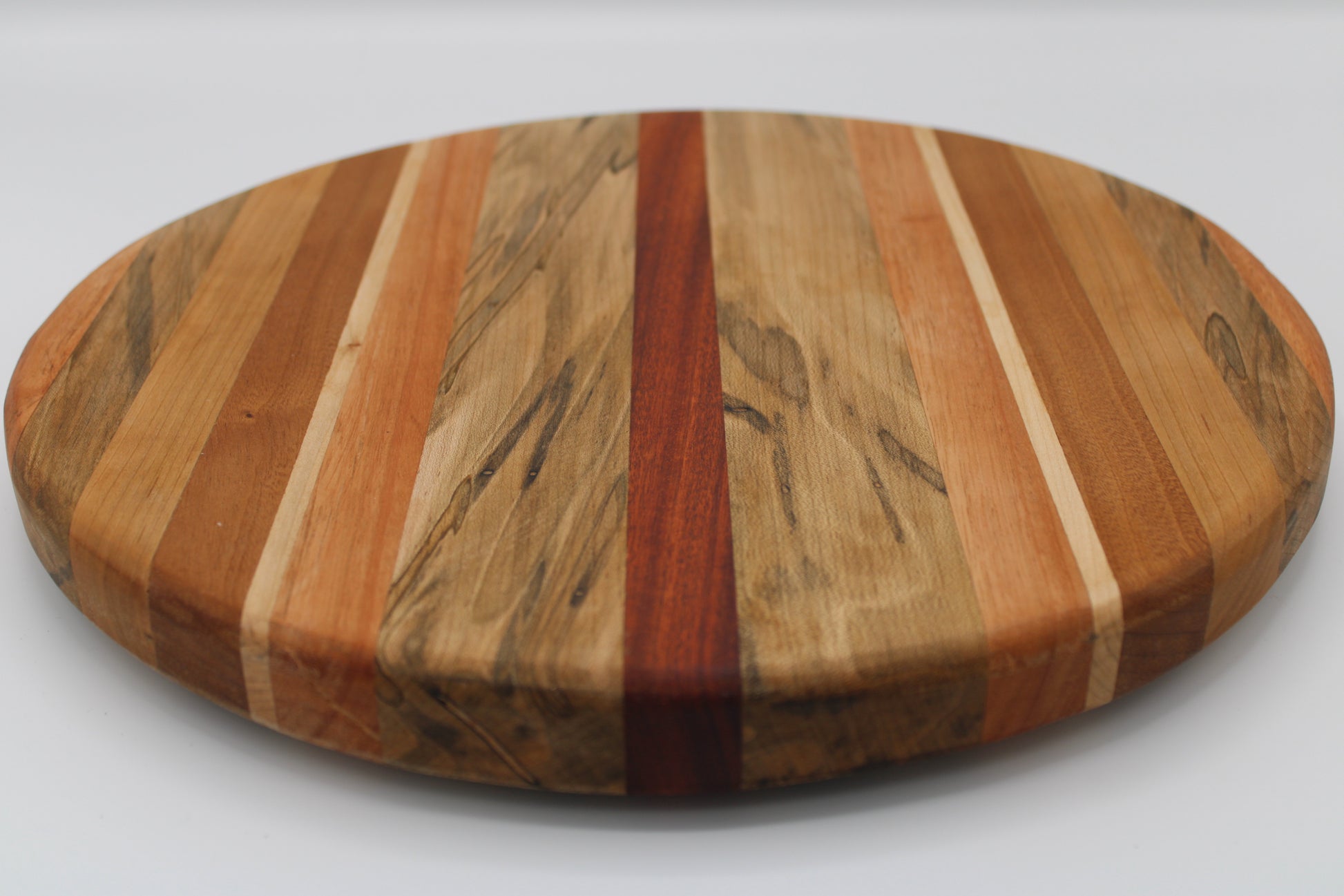 Design #060 - handmade with five different hardwoods - Cherry, Wormy Red Maple, Red Grandis, Bloodwood and Mahogany - designed with fifteen stripes. It is ready to take on any cutting task in your kitchen.