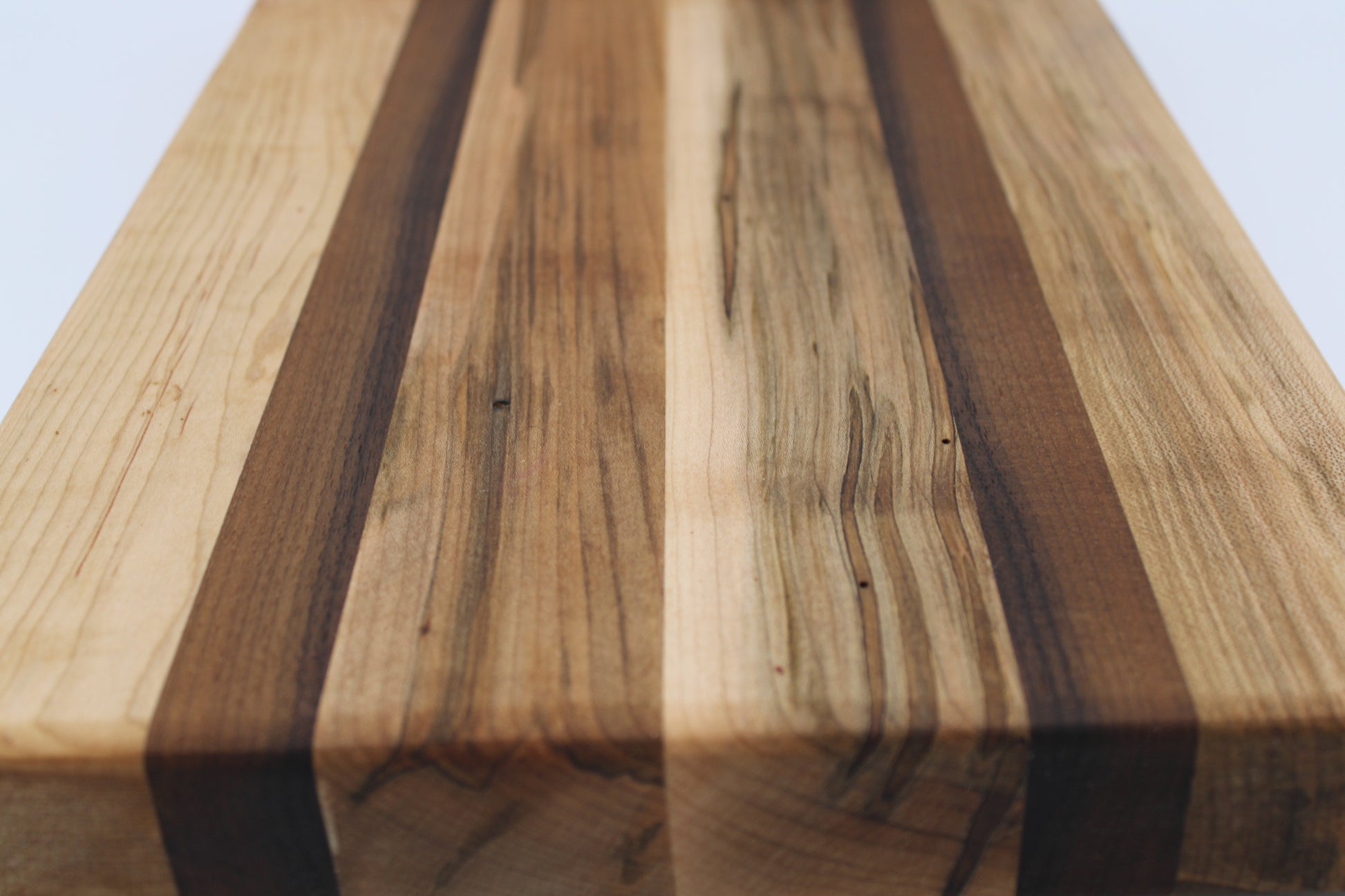 Design #062 - handmade with two different hardwoods - Wormy Red Maple and Walnut - designed with six horizontal stripes. This end cut board is ready to take on any cutting task in your kitchen.