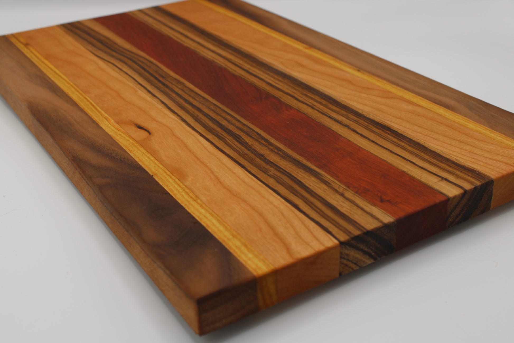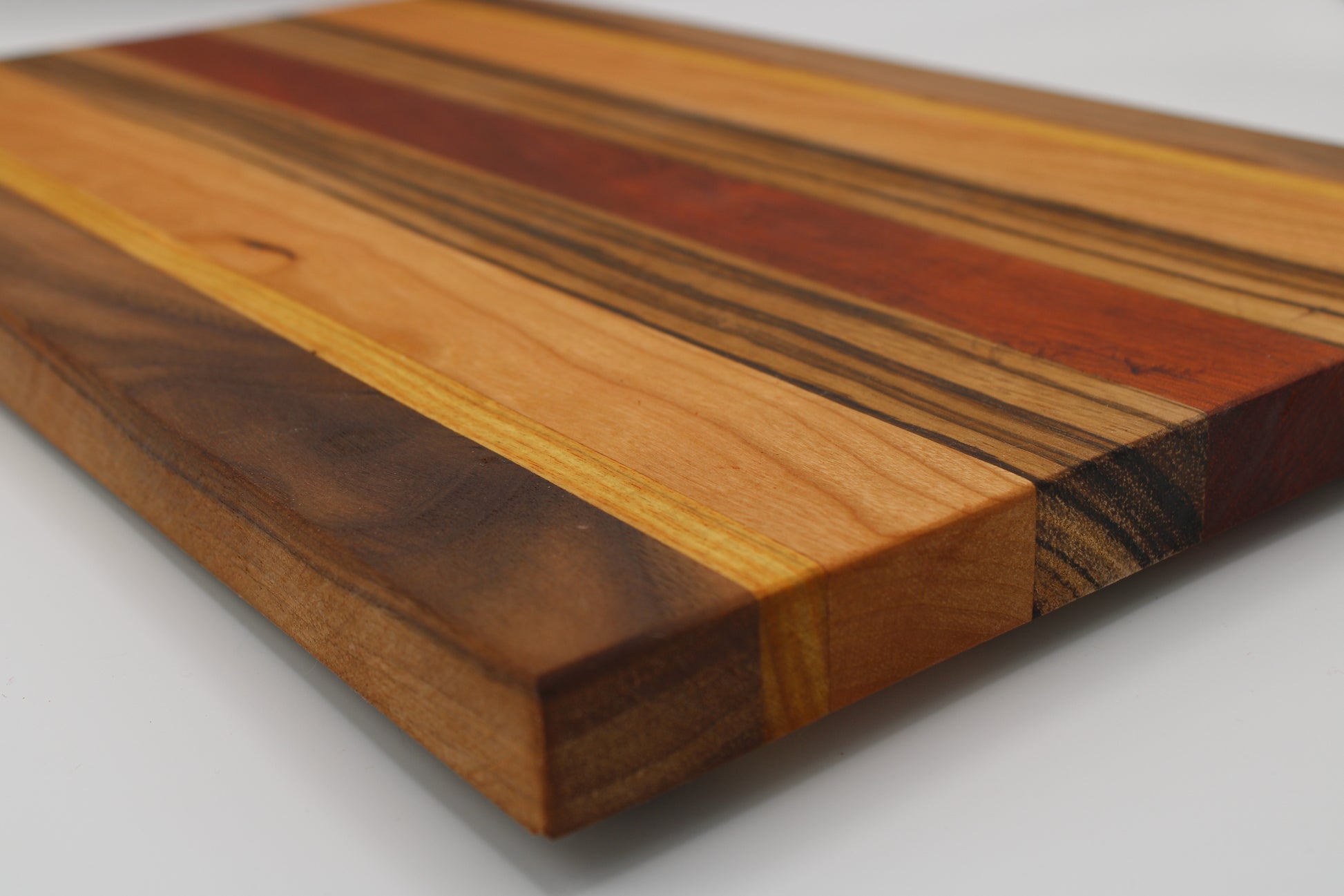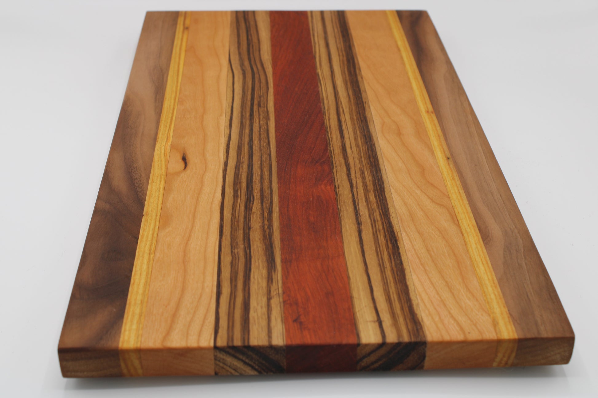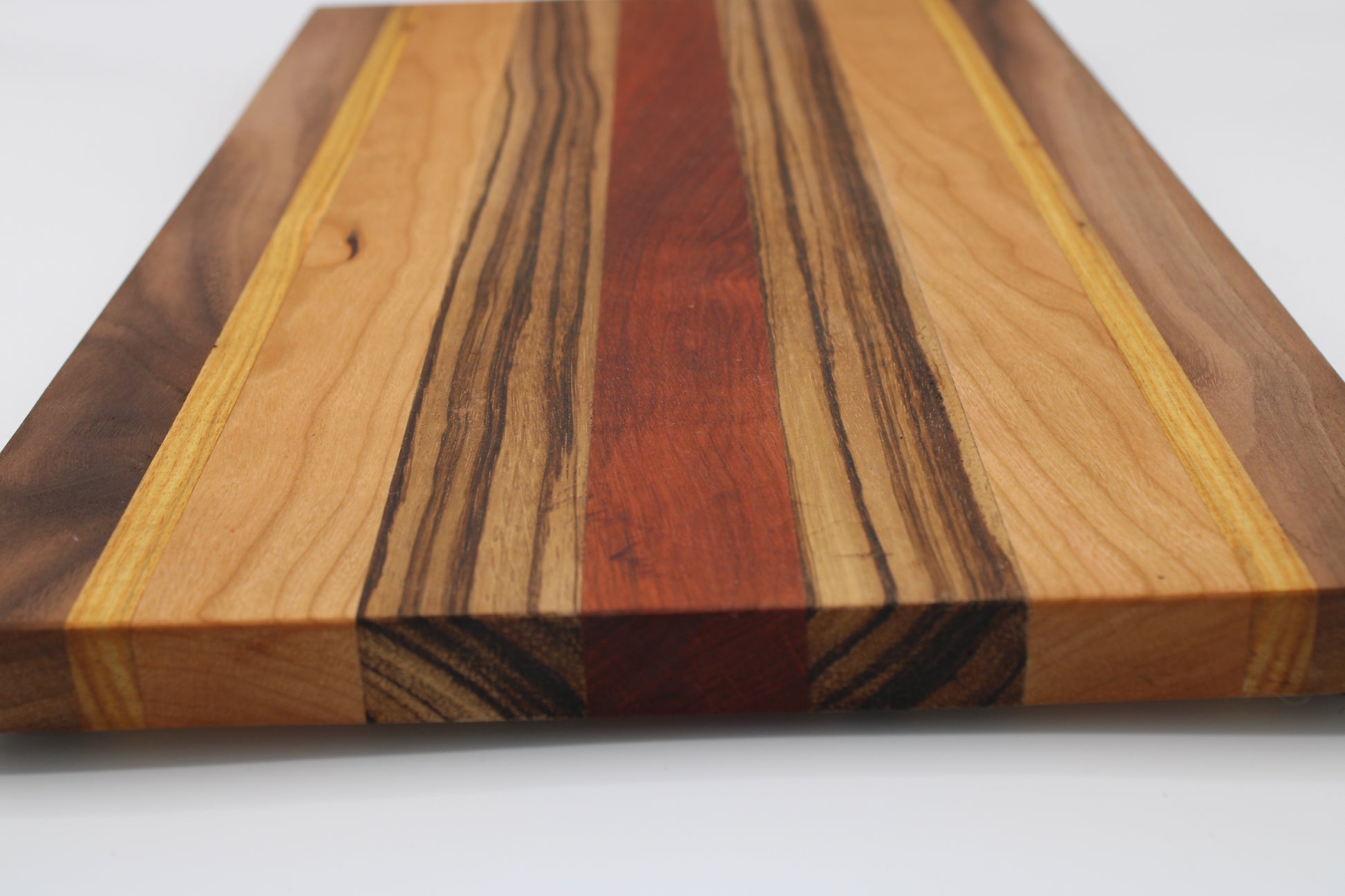 Design #109 - handmade with five different hardwoods - Bloodwood, Canarywood, Cherry, Zebrawood and Walnut - designed with 9 stripes and ready to take on any cutting task in your kitchen.