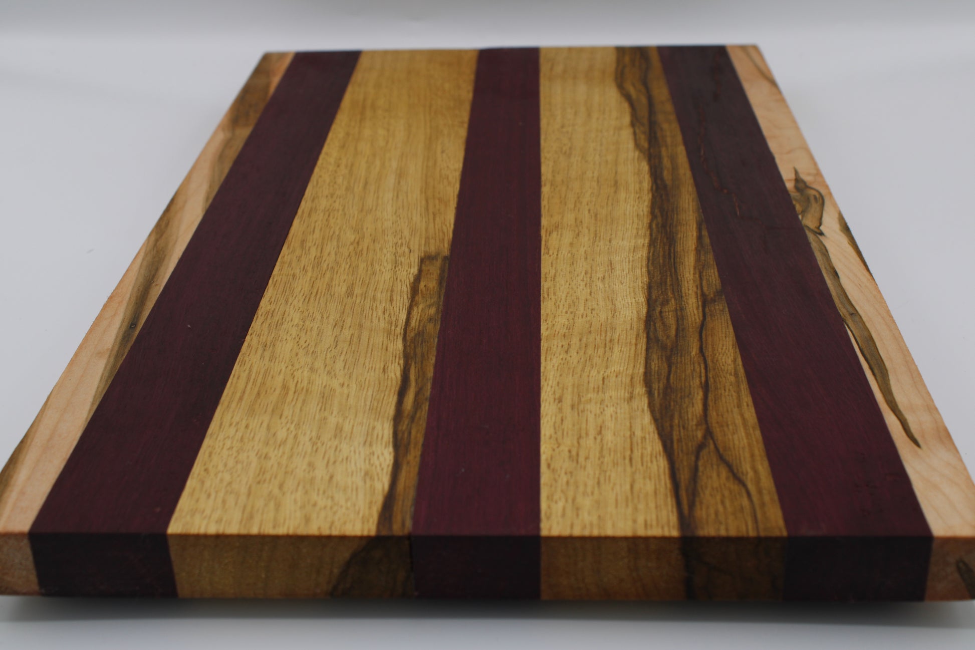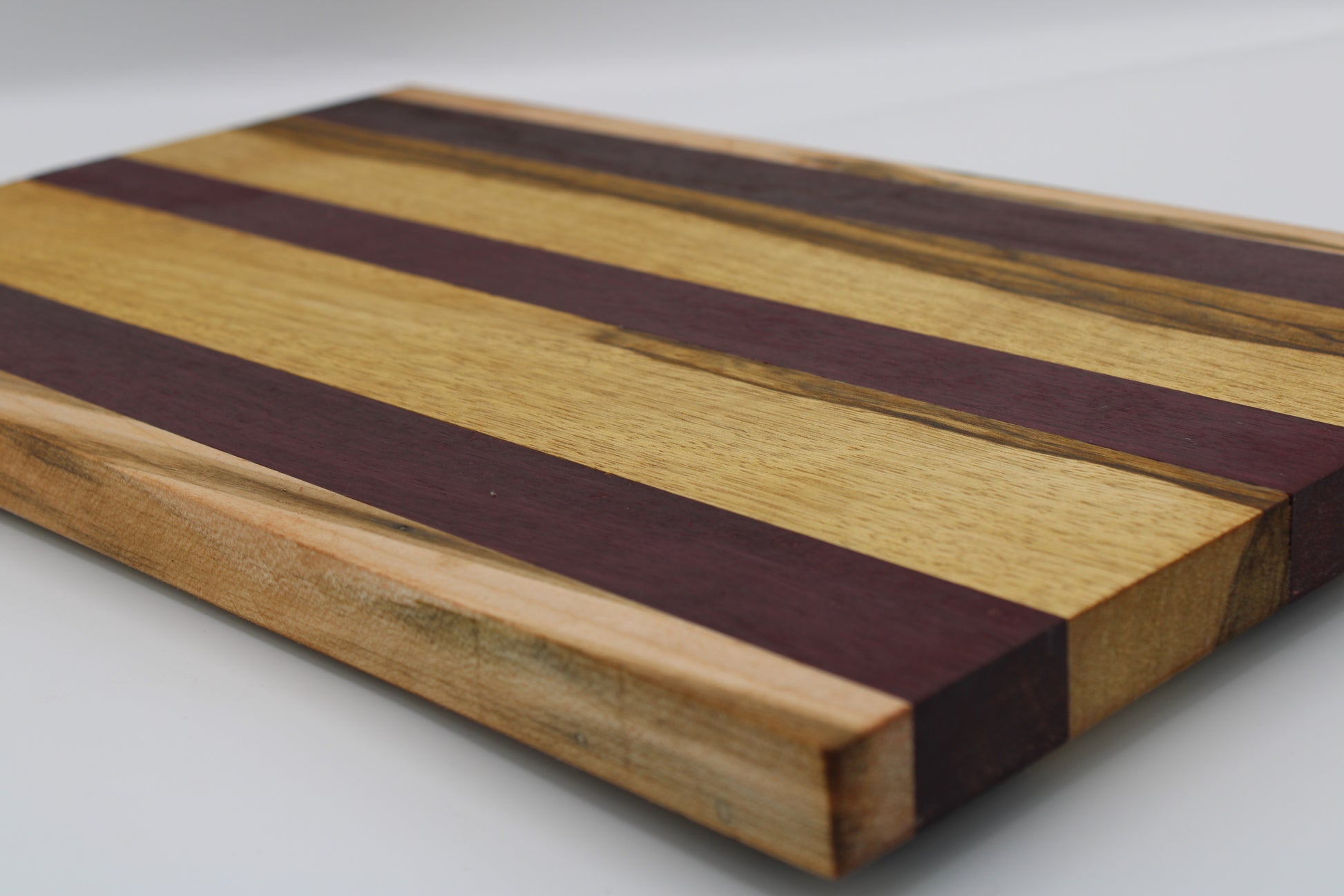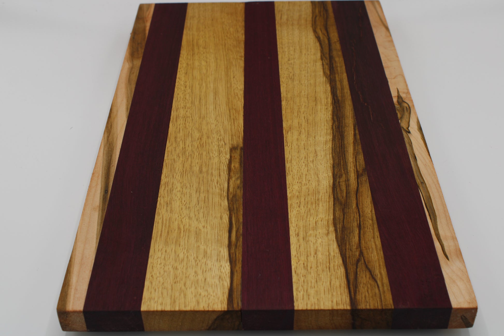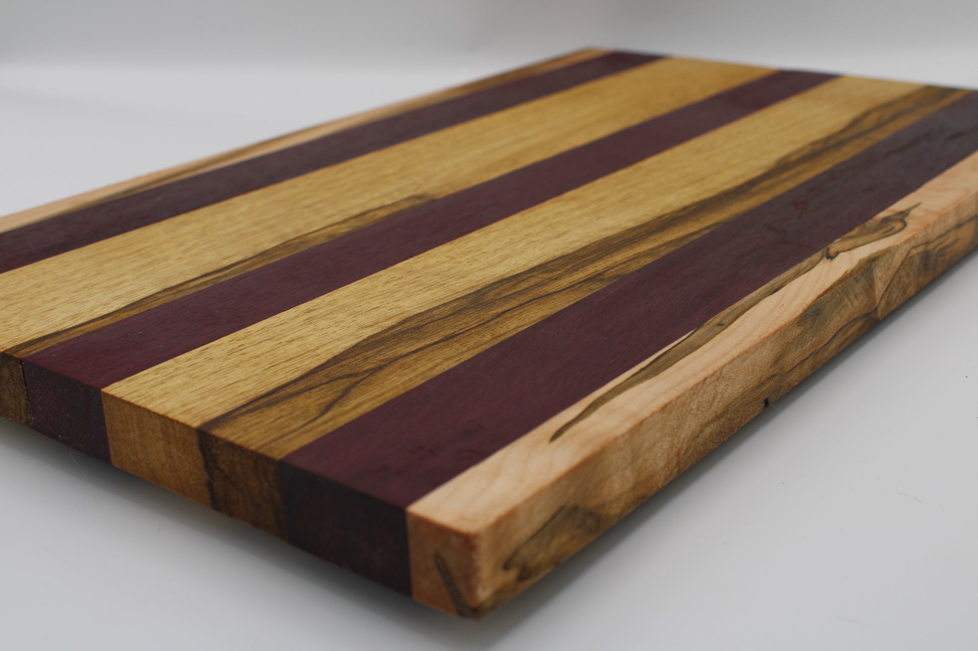 Design #132 - handmade with three different hardwoods - Black Limba, Purpleheart and Wormy Red Maple - designed with seven stripes and ready to take on any cutting task in your kitchen.
