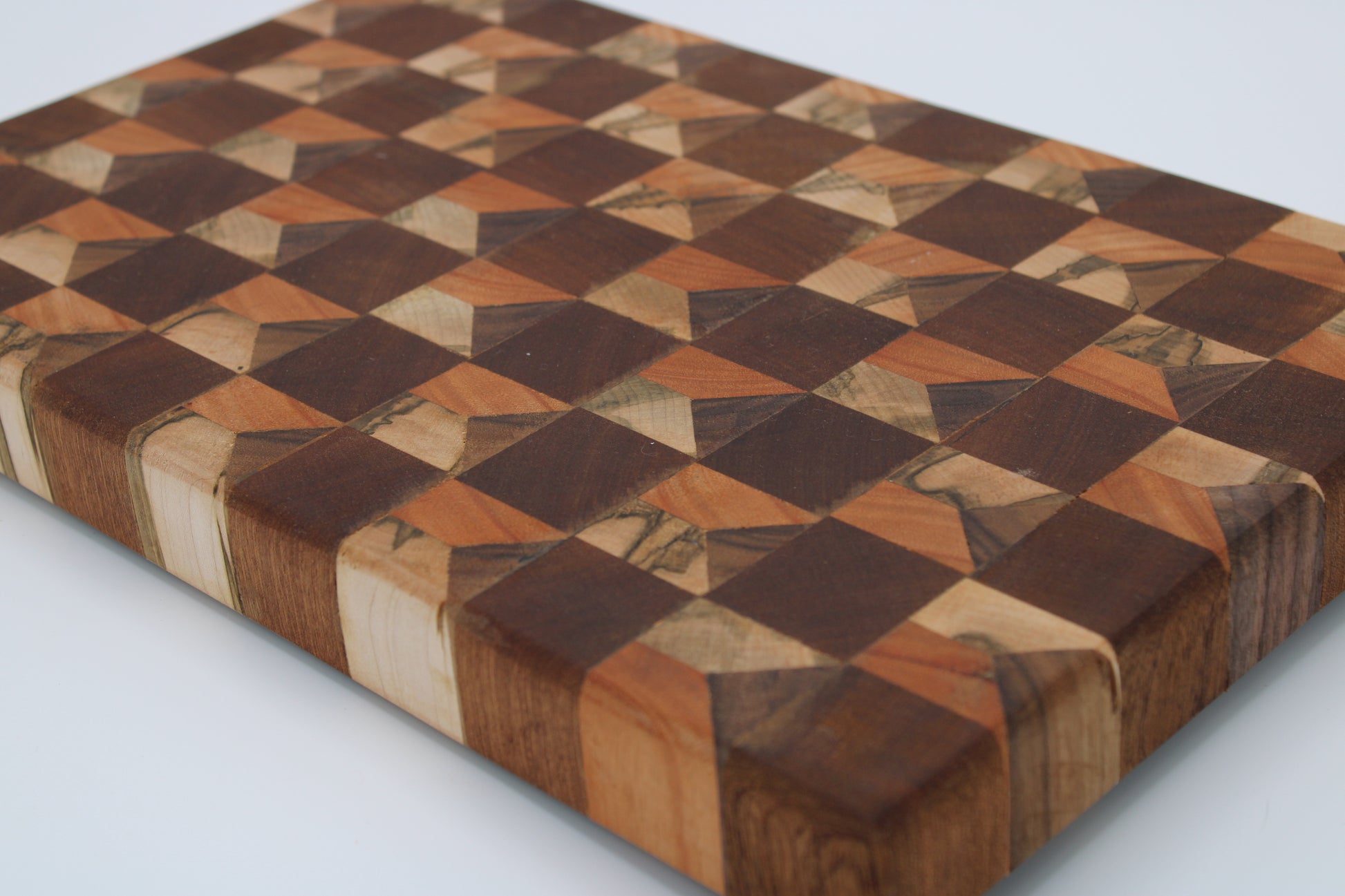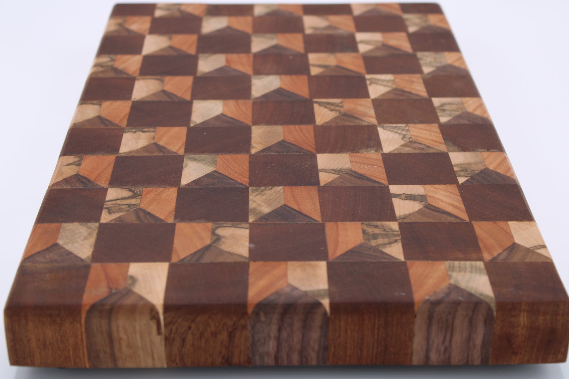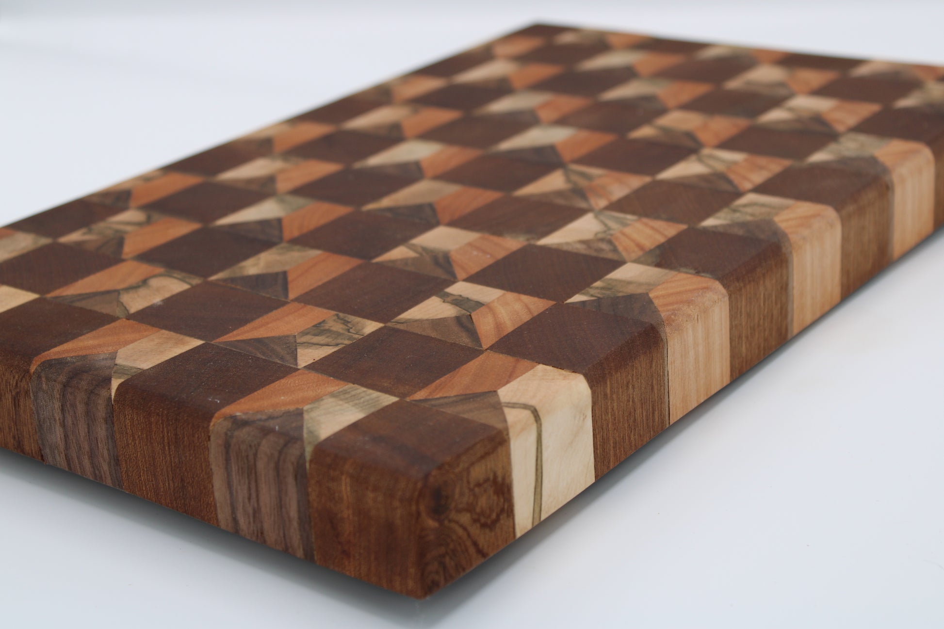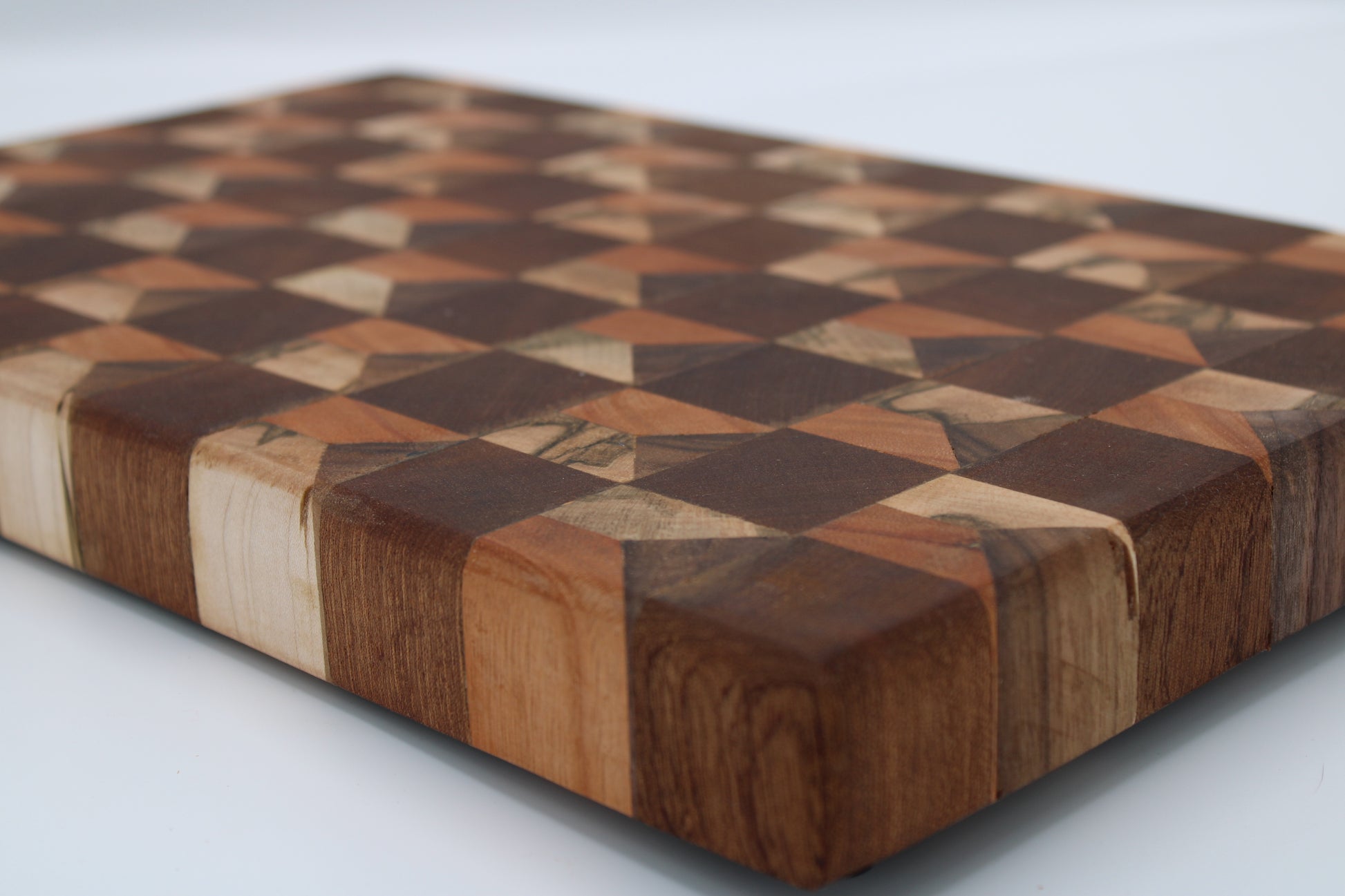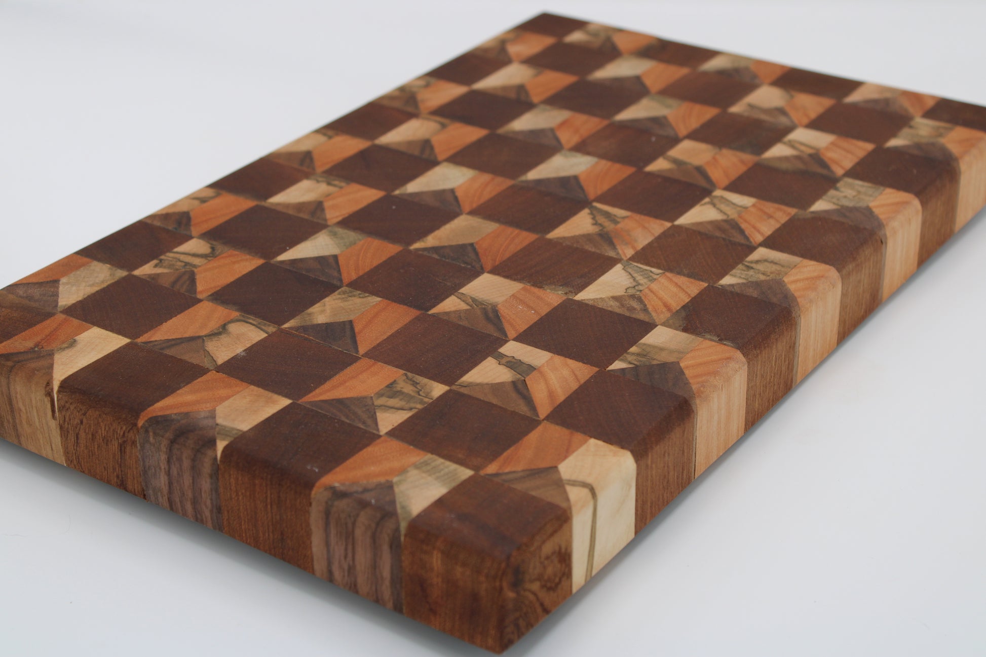 Design #134 - handmade with three different hardwoods - Red Grandis, Sapele, Walnut and Wormy Red Maple - designed with unique edge cut dimensional pattern and ready to take on any cutting task in your kitchen.