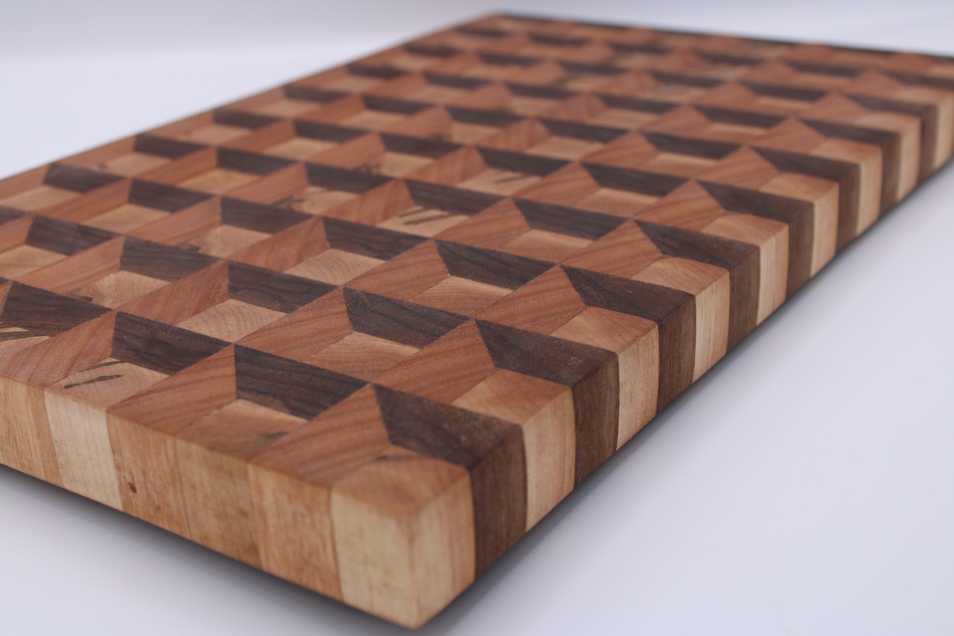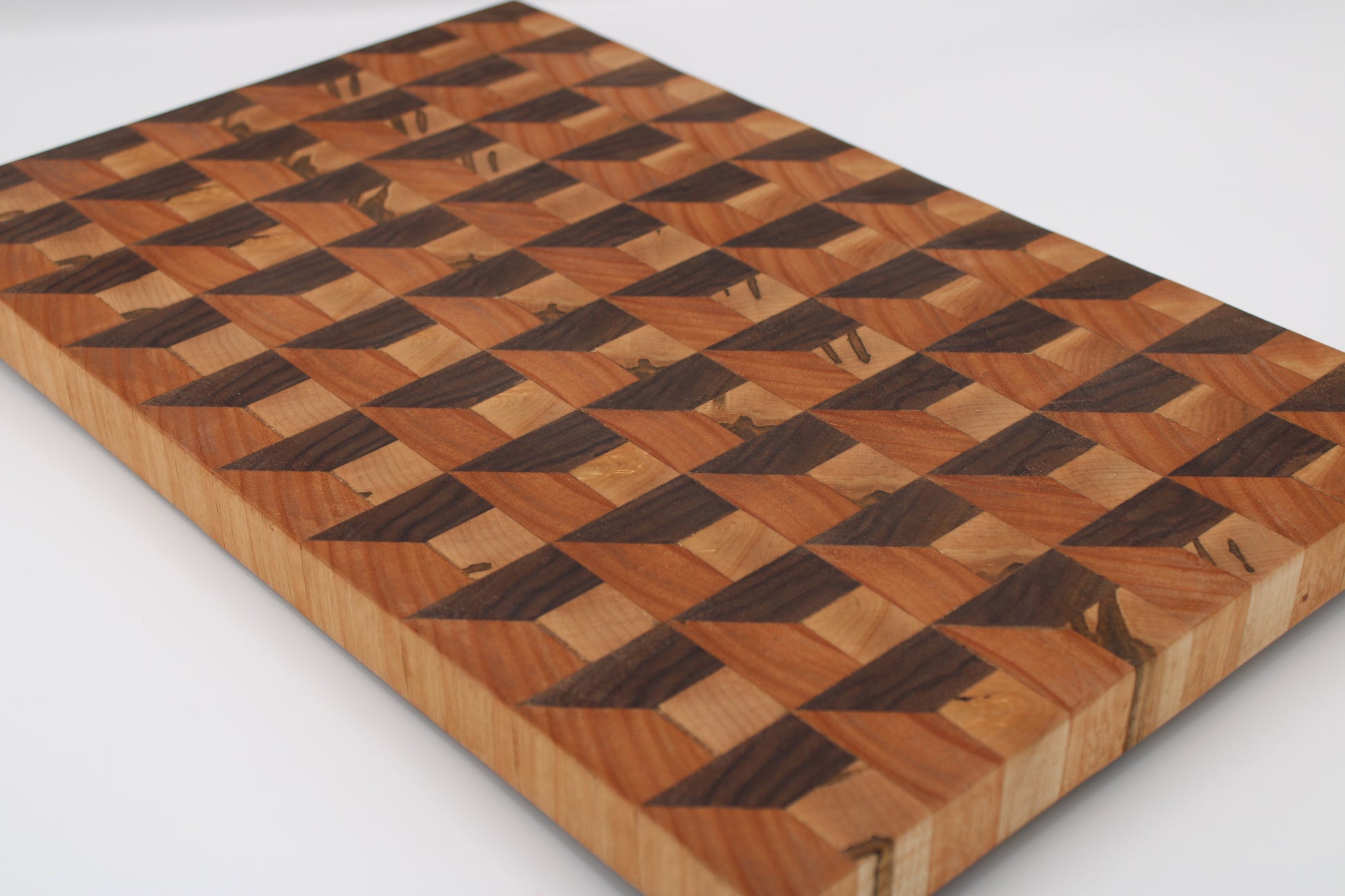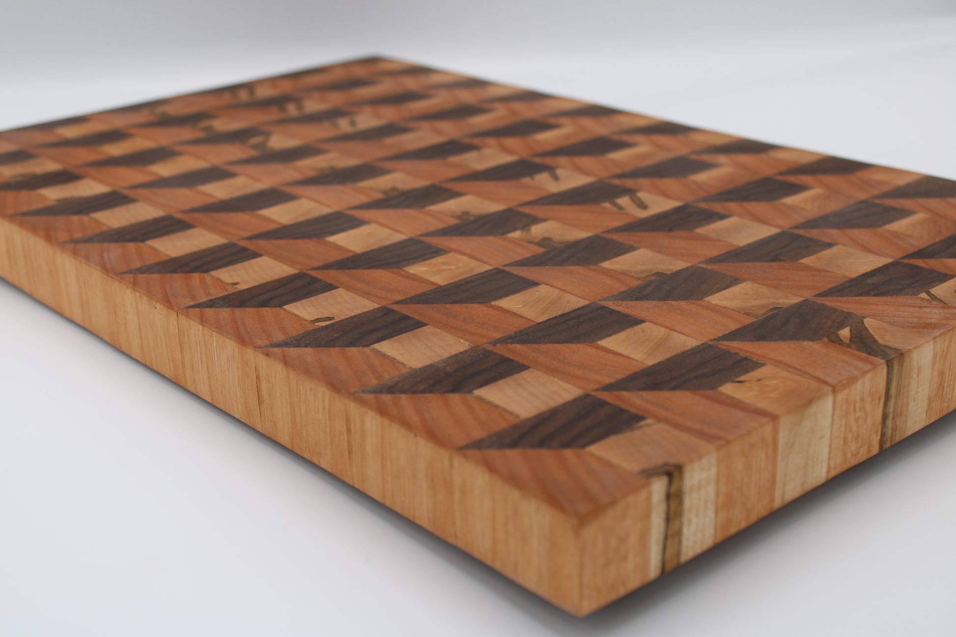 Design #135 - handmade with three different hardwoods - Wormy Red Maple, Red Grandis and Walnut - designed with a unique 3D design and ready to take on any cutting task in your kitchen.