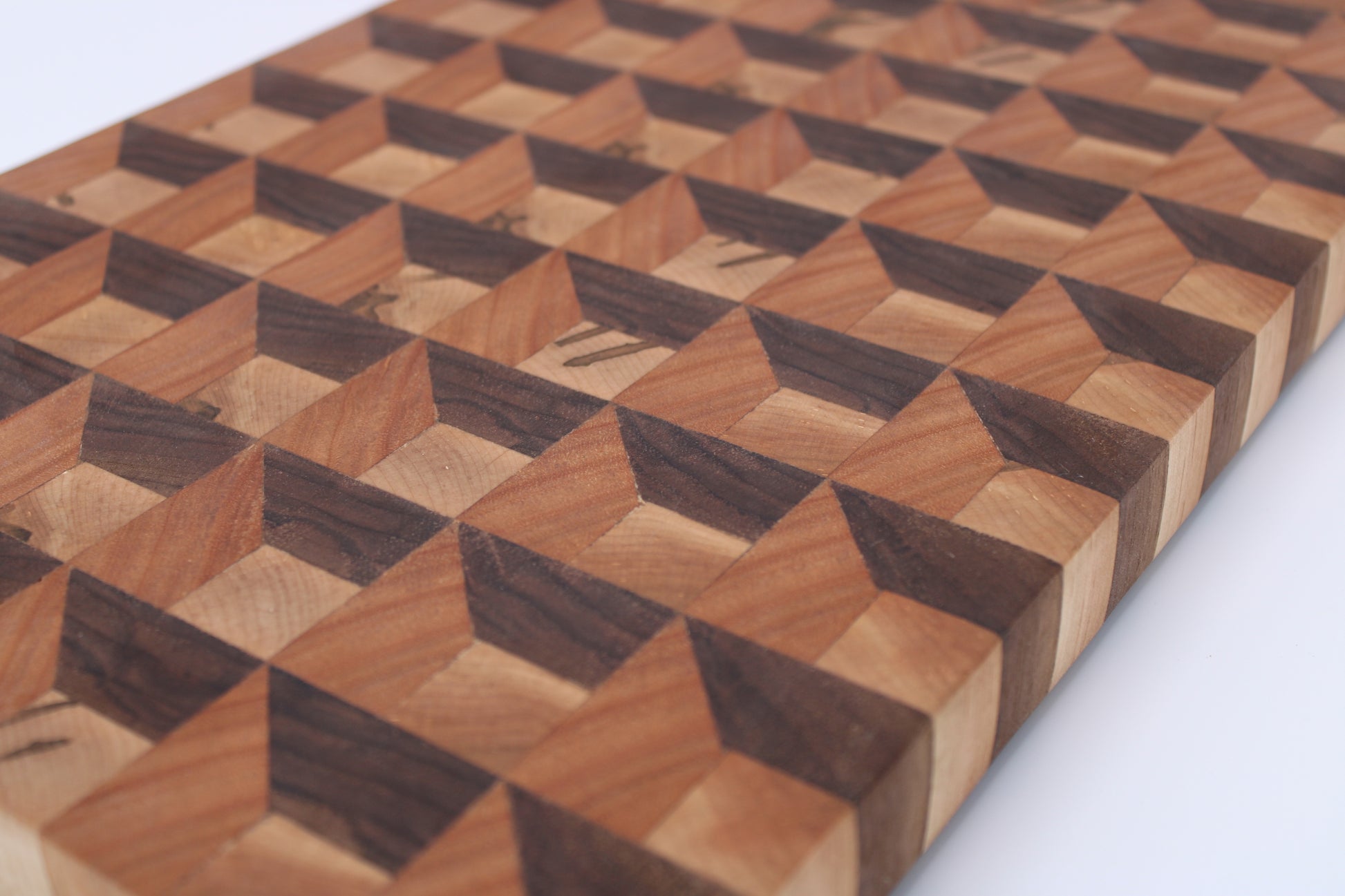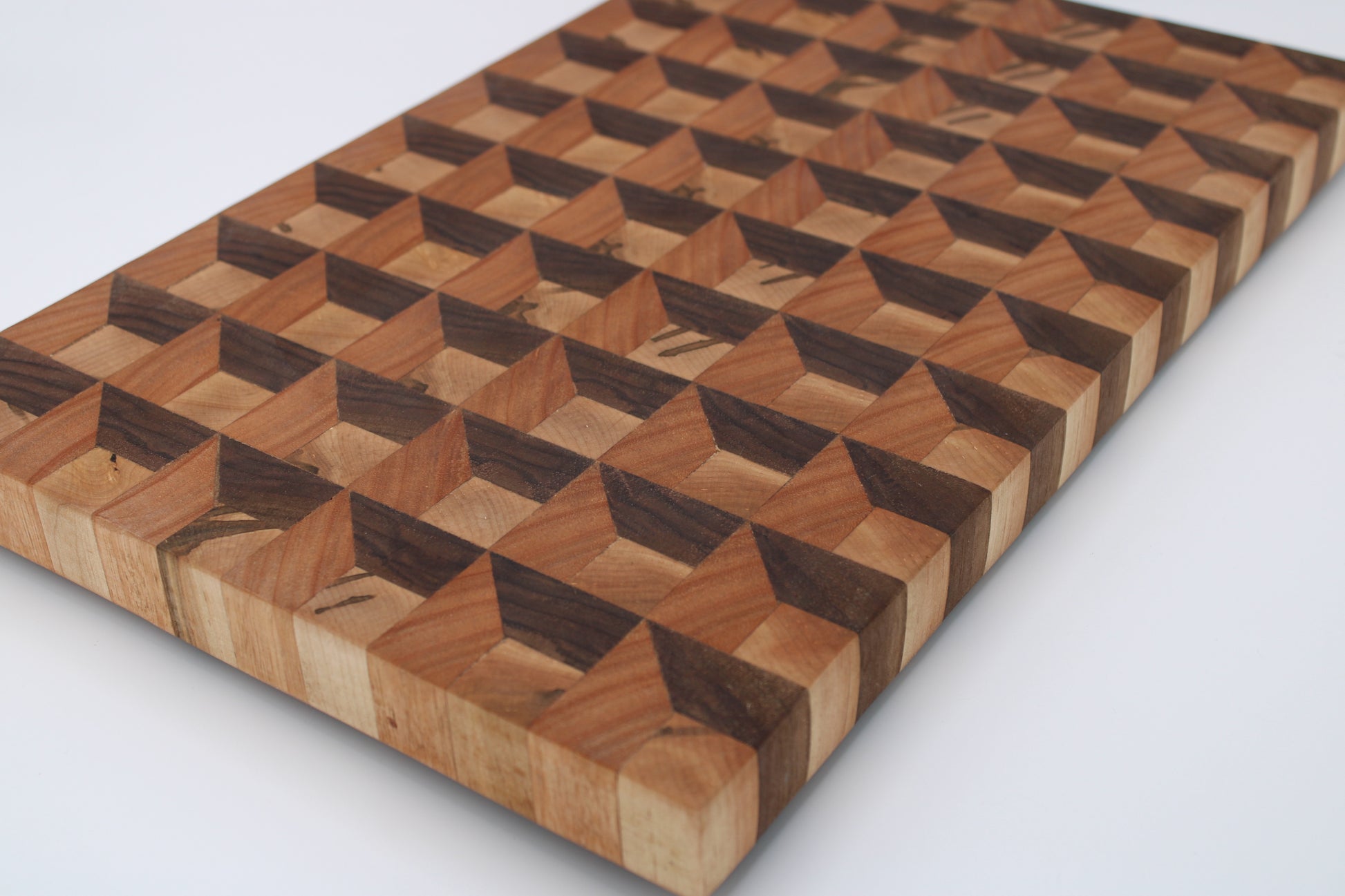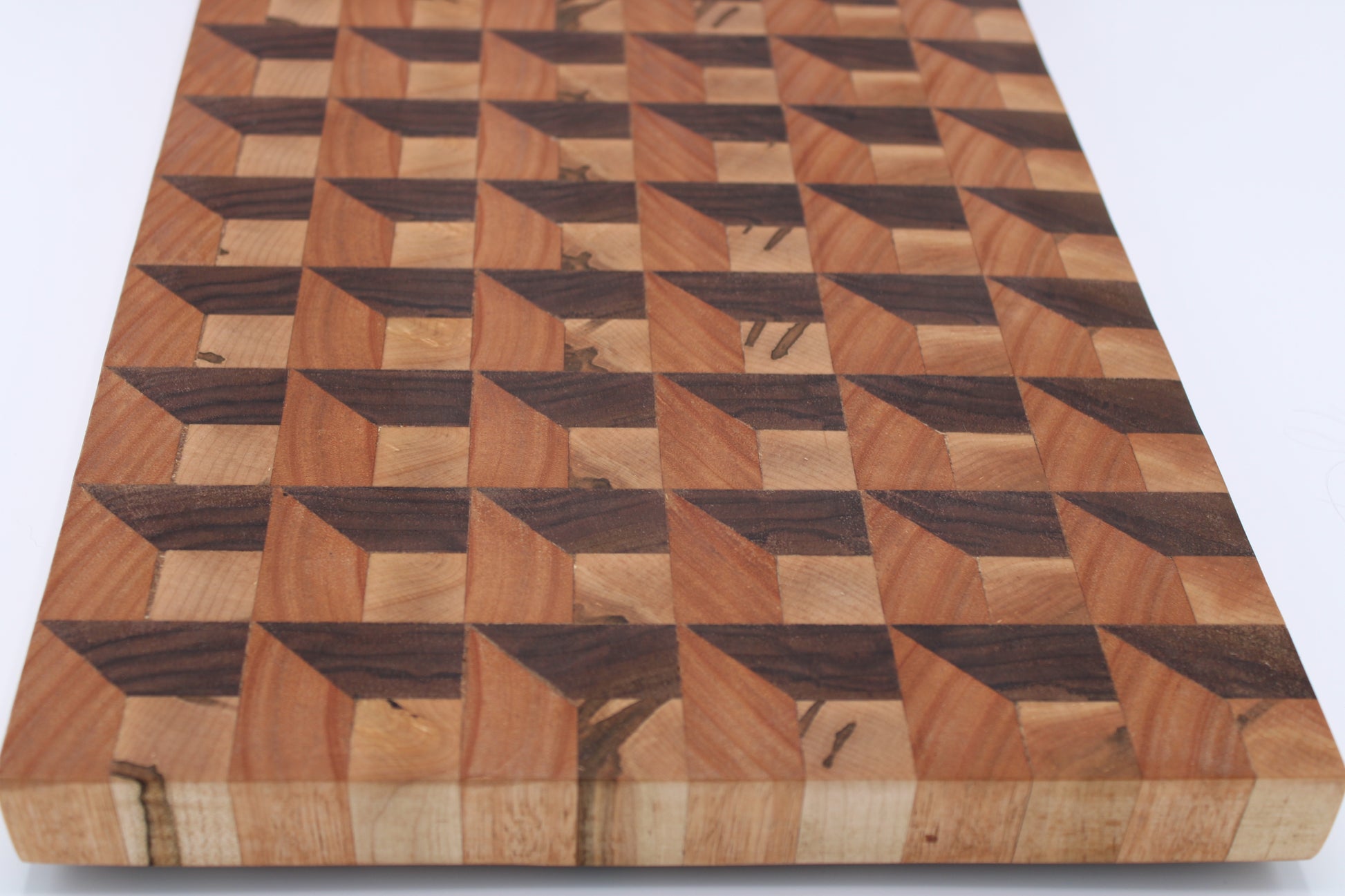 Design #135 - handmade with three different hardwoods - Wormy Red Maple, Red Grandis and Walnut - designed with a unique 3D design and ready to take on any cutting task in your kitchen.