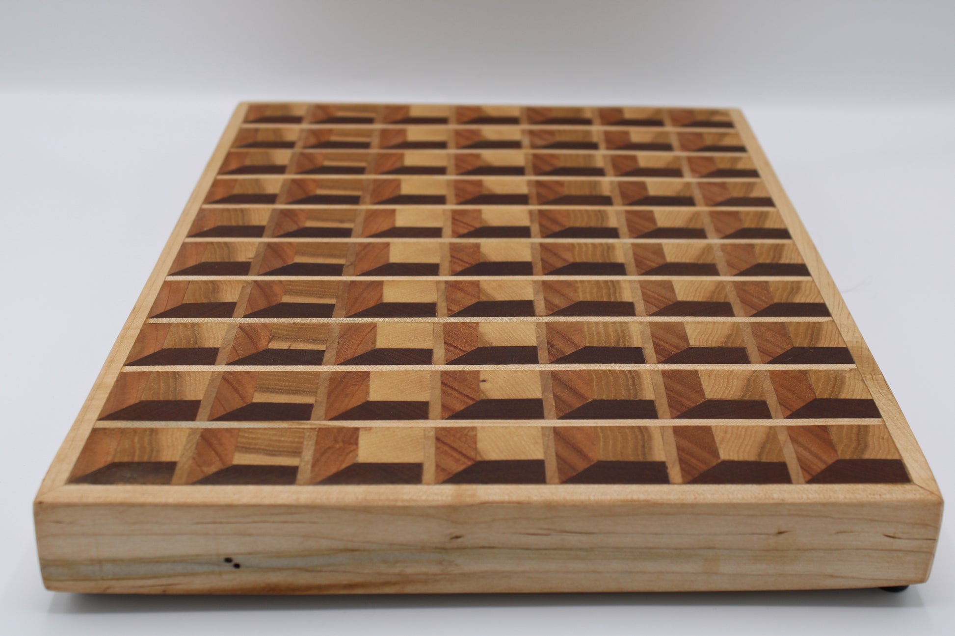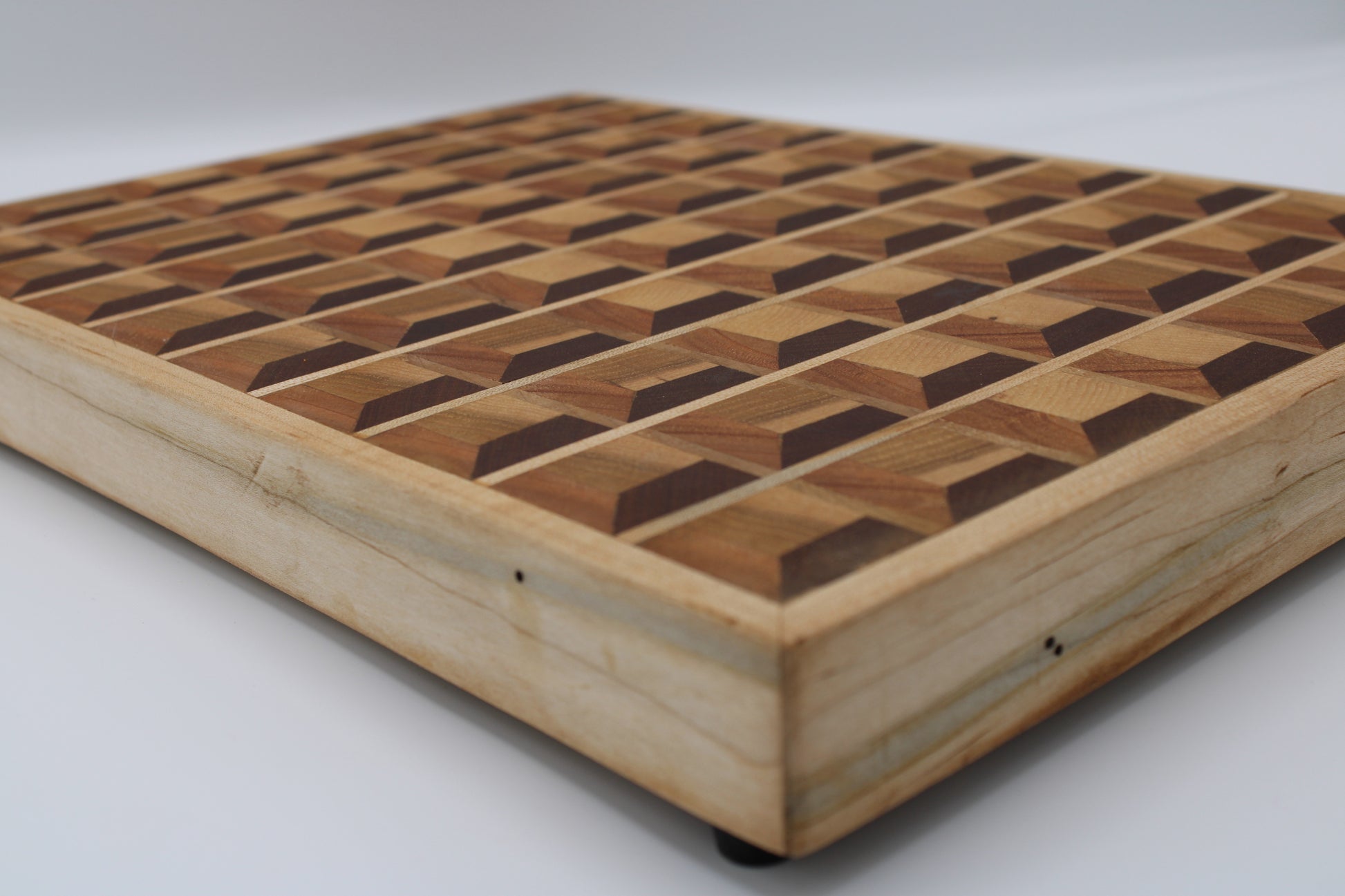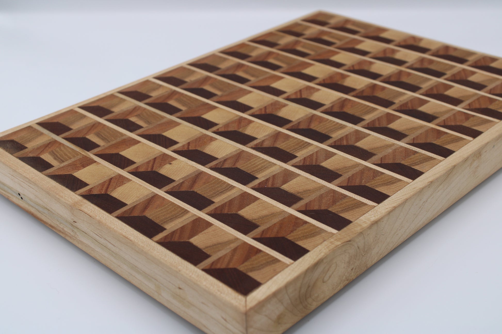 Design #139 - handmade with four different hardwoods - Hickory, Wormy Red Maple, Red Grandis and Sapele - designed with a unique 3D design and ready to take on any cutting task in your kitchen.