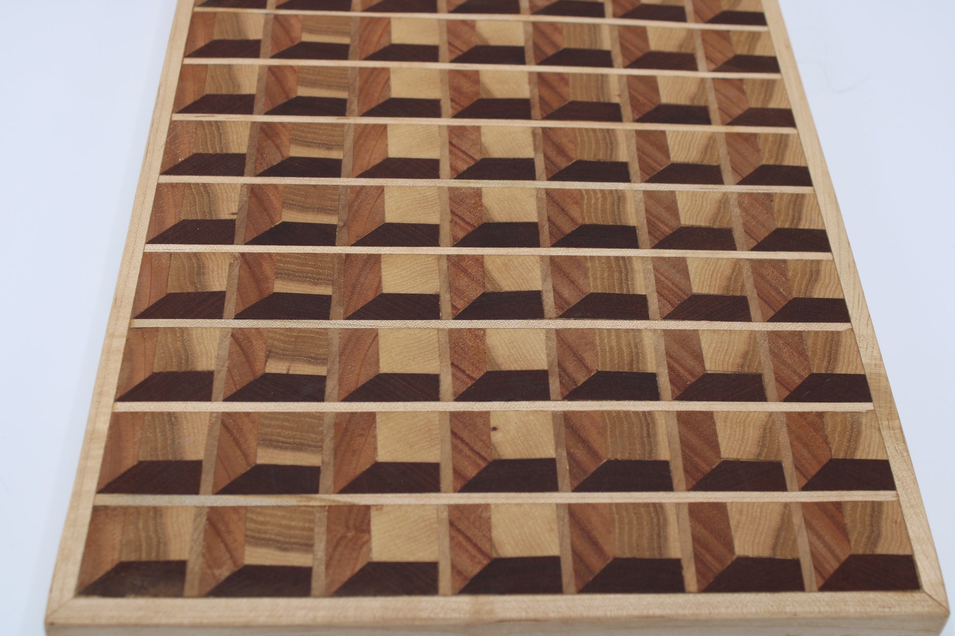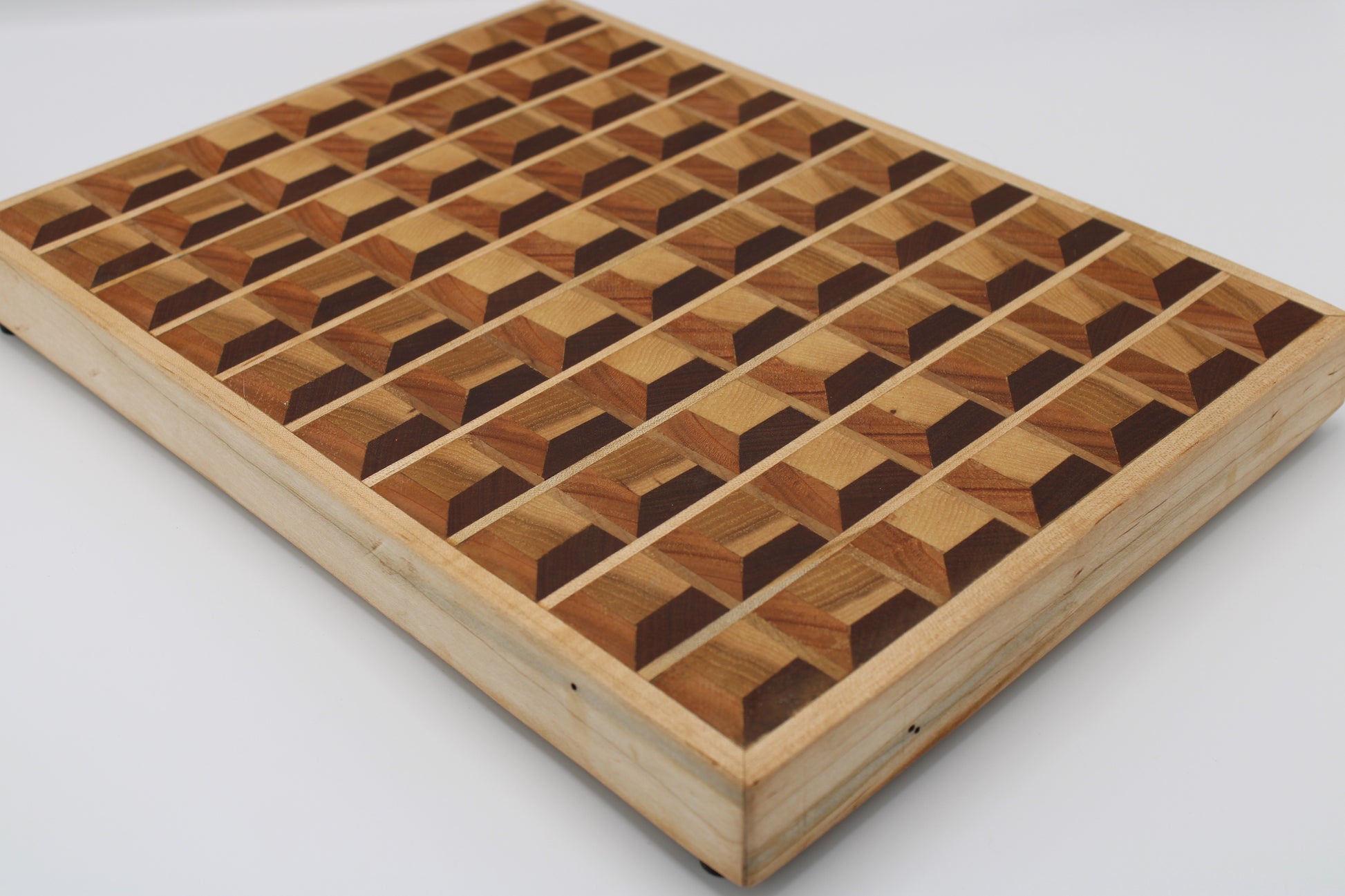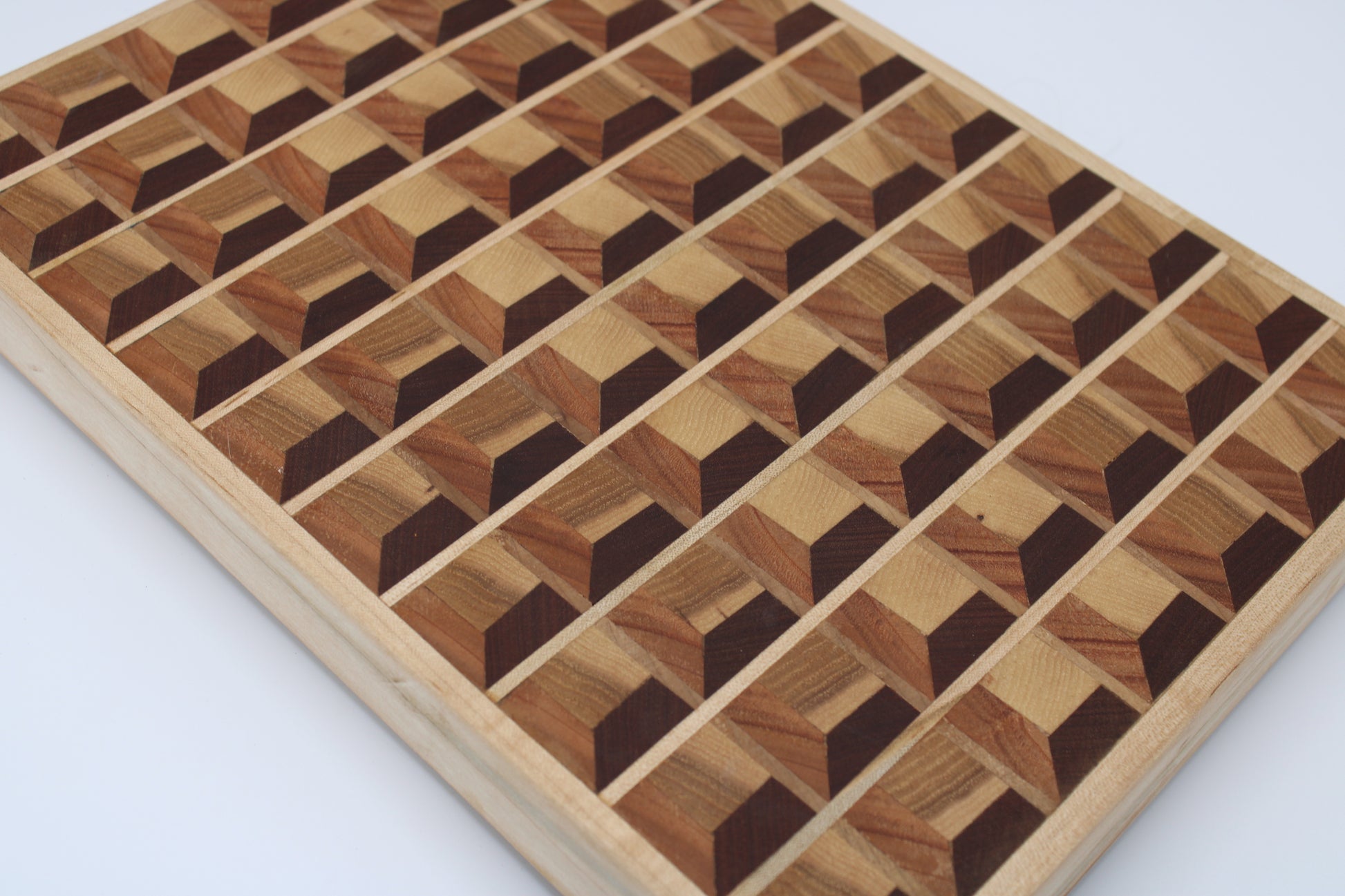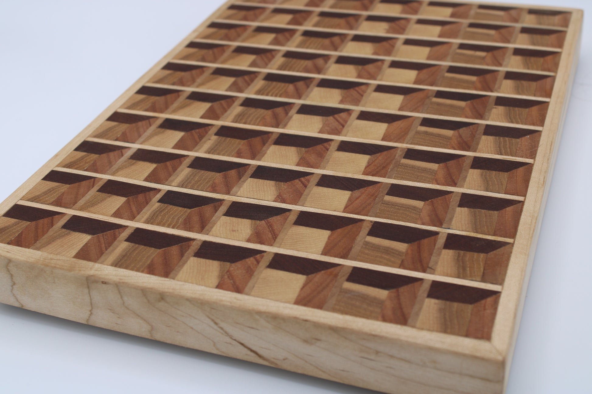Design #139 - handmade with four different hardwoods - Hickory, Wormy Red Maple, Red Grandis and Sapele - designed with a unique 3D design and ready to take on any cutting task in your kitchen.