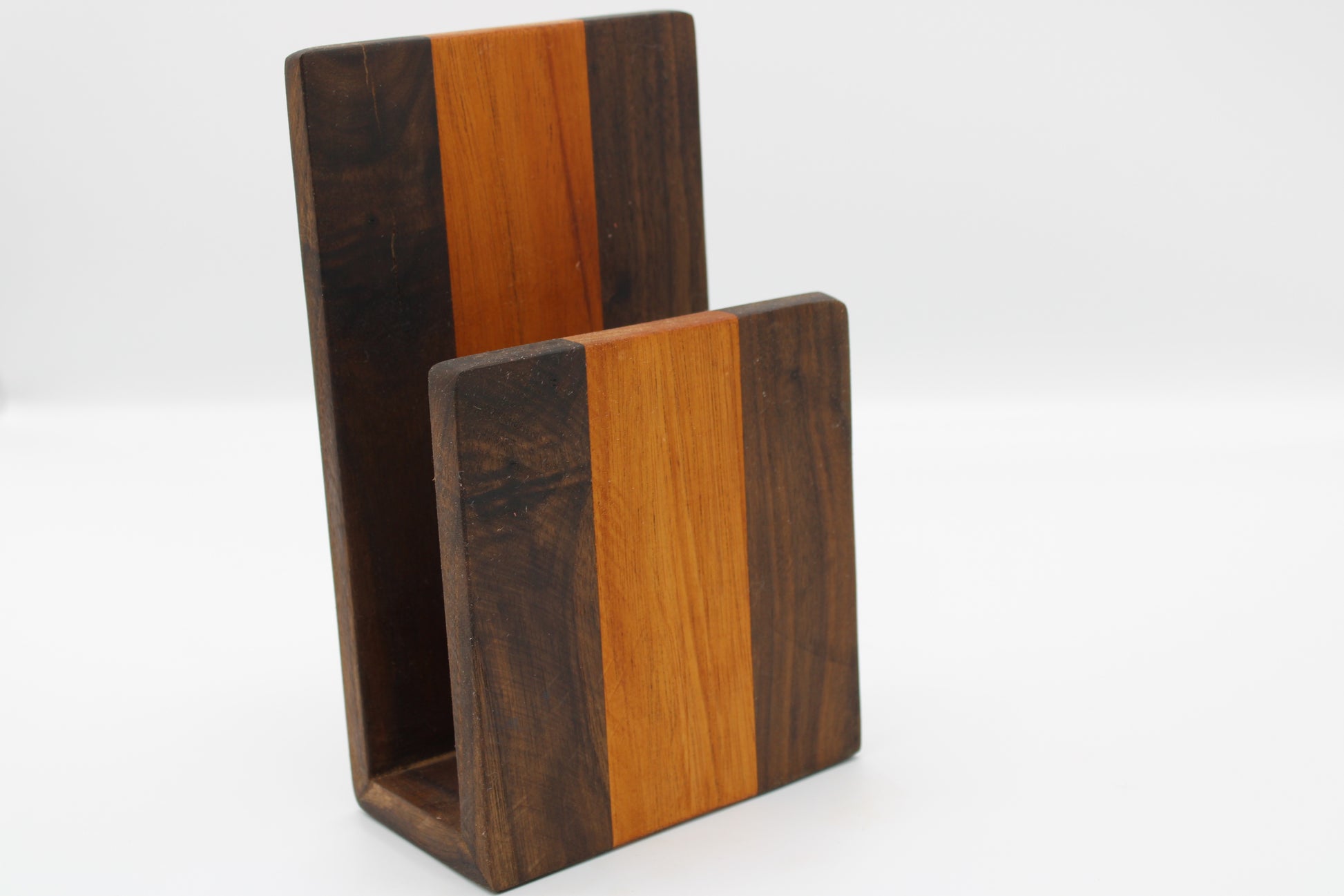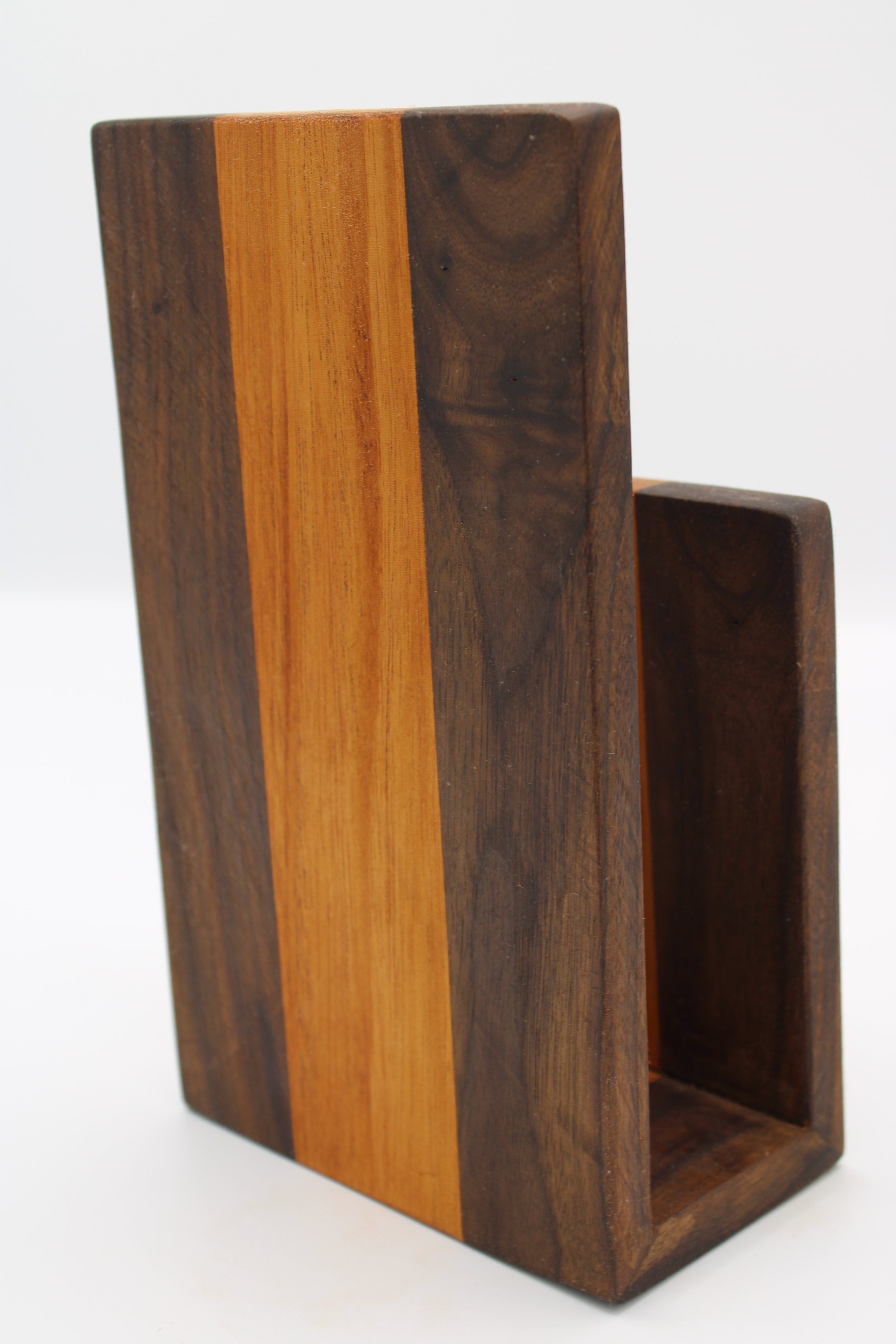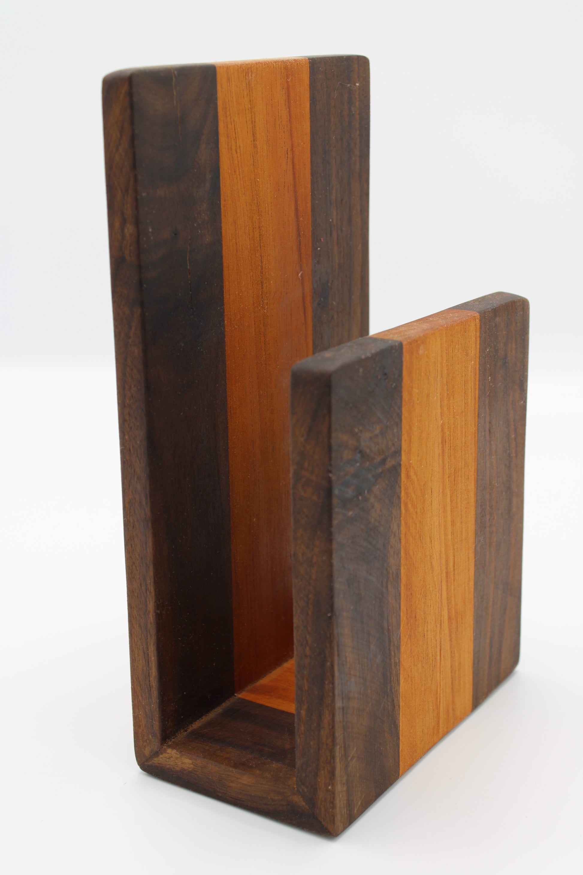 Stylish hardwood napkin holder adds class to any decor. It could also be used for holding your mail or you electronic devices while they are charging! The perfect gift for someone who has everything! Handcrafted with Mahogany and Walnut hardwood. They can be passed down as a family heirloom since they can last for generations!